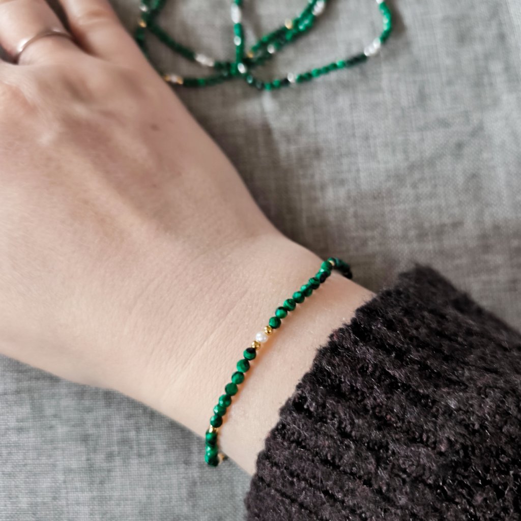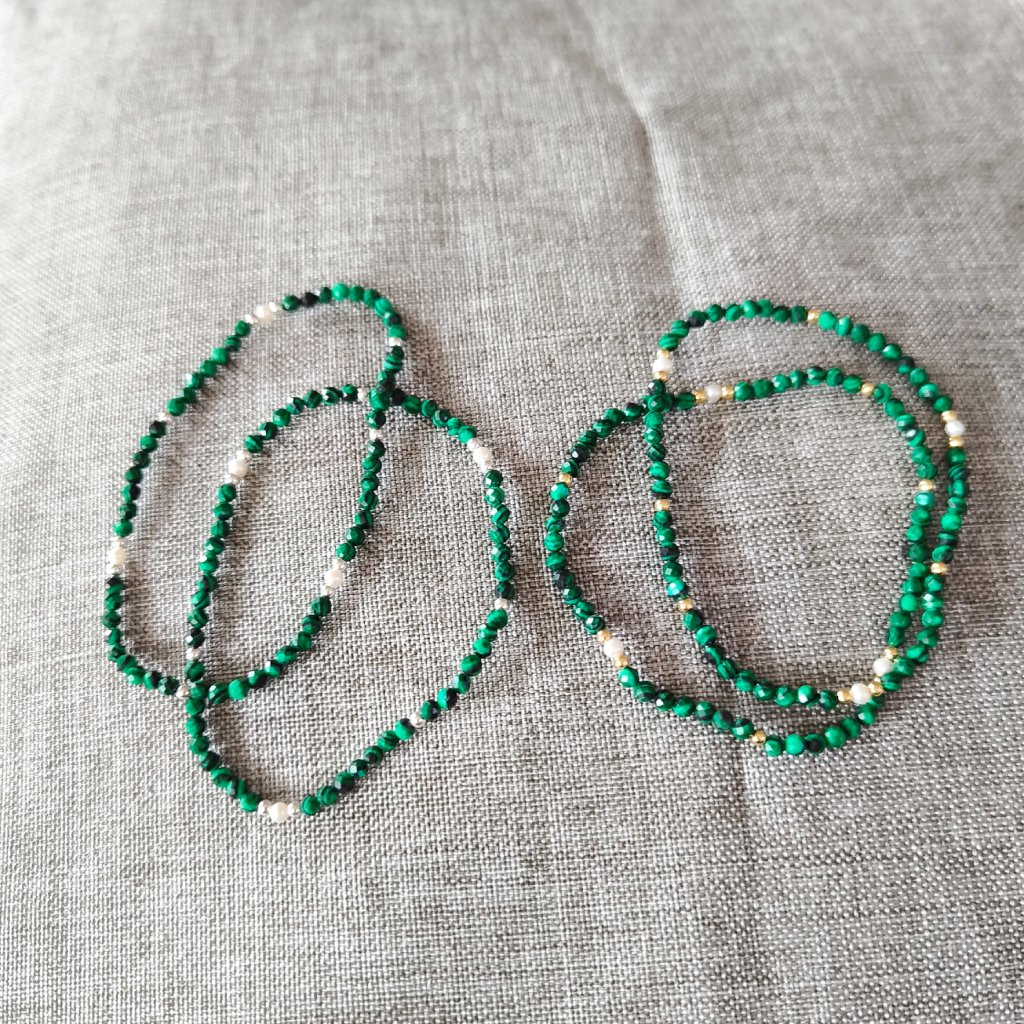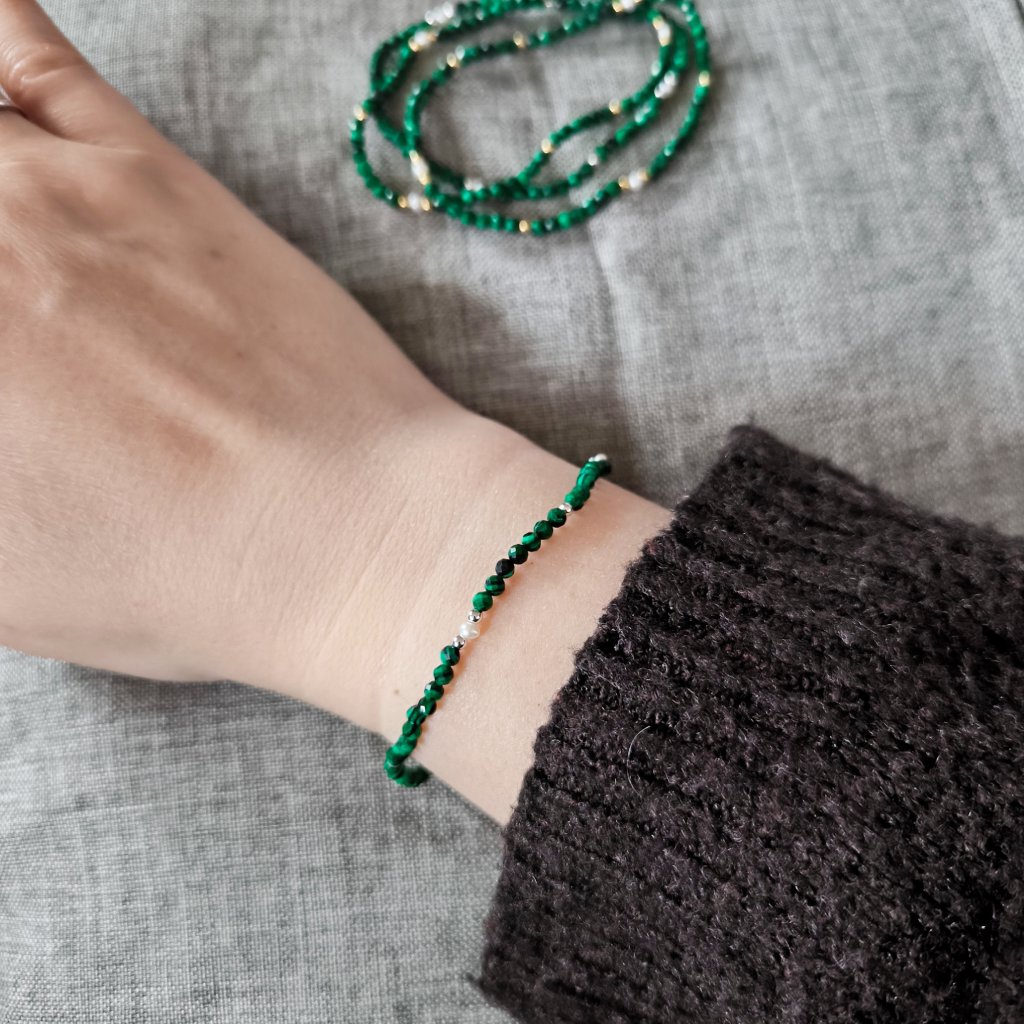 ✨ Kombinace malých perel, stříbrných korálků a broušených malachitů vytváří přirozeně hravý, a přitom nadčasový vzhled.