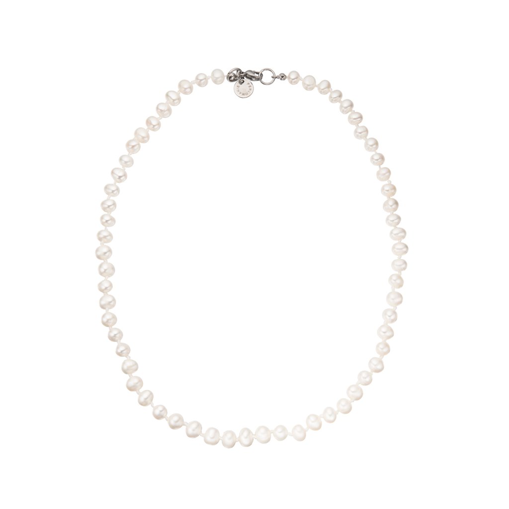 Náhrdelník jsme vyrobili z bílých polokulatých perel kvality A až AA. Díky tomu na perlách můžete vidět jejich přirozené rýhy a jemné nedokonalosti. Vznikl tak šperk, který můžete nosit každý den. Perlový náhrdelník je tak originální a jedinečný a odlišuje se od klasických perlových náhrdelníků kvality AAA. Získáte tak šperk, na kterém vidíte práci samotné přírody. Náhrdelník z nepravidelných bílých perel je prostě poklad.