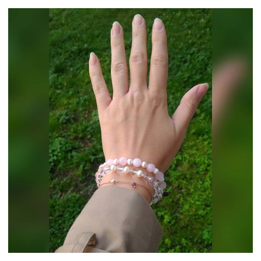 Náramek zdobí jemná kombinace perel a polodrahokamů - čirý přírodní křišťál a bílé sladkovodní perly. Náramek, který je jemný a elegantní