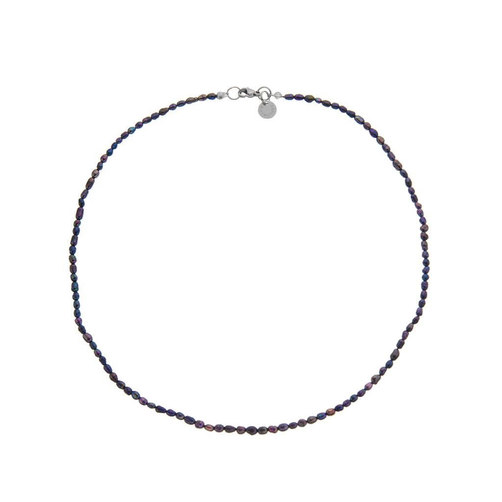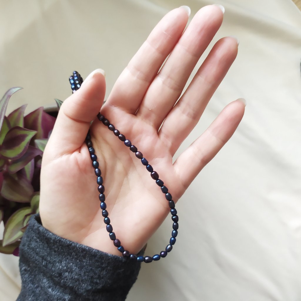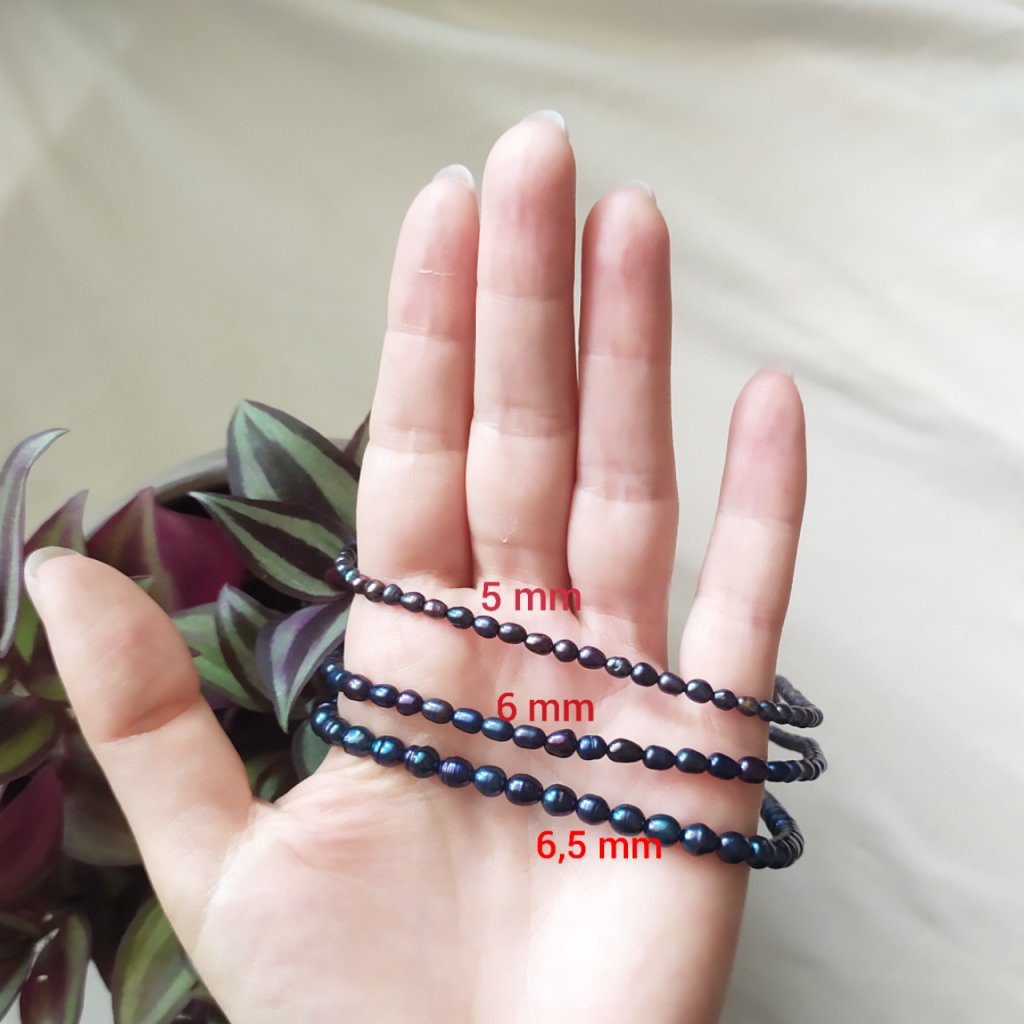 Tento náhrdelník jsme vyrobili z menších tmavých oválných (rýžových) perel. Barva perel je s odlesky do šeda, modra a zelena. Jejich velikost je zhruba 6 mm na délku a 4 mm na šířku. Sladkovodní kultivované perly jsou vysoké kvality. Každý perlový šperk je absolutně jedinečný. Tyto perly vytvořila sama příroda a jejich přirozenou krásu můžete mít na sobě každý den.