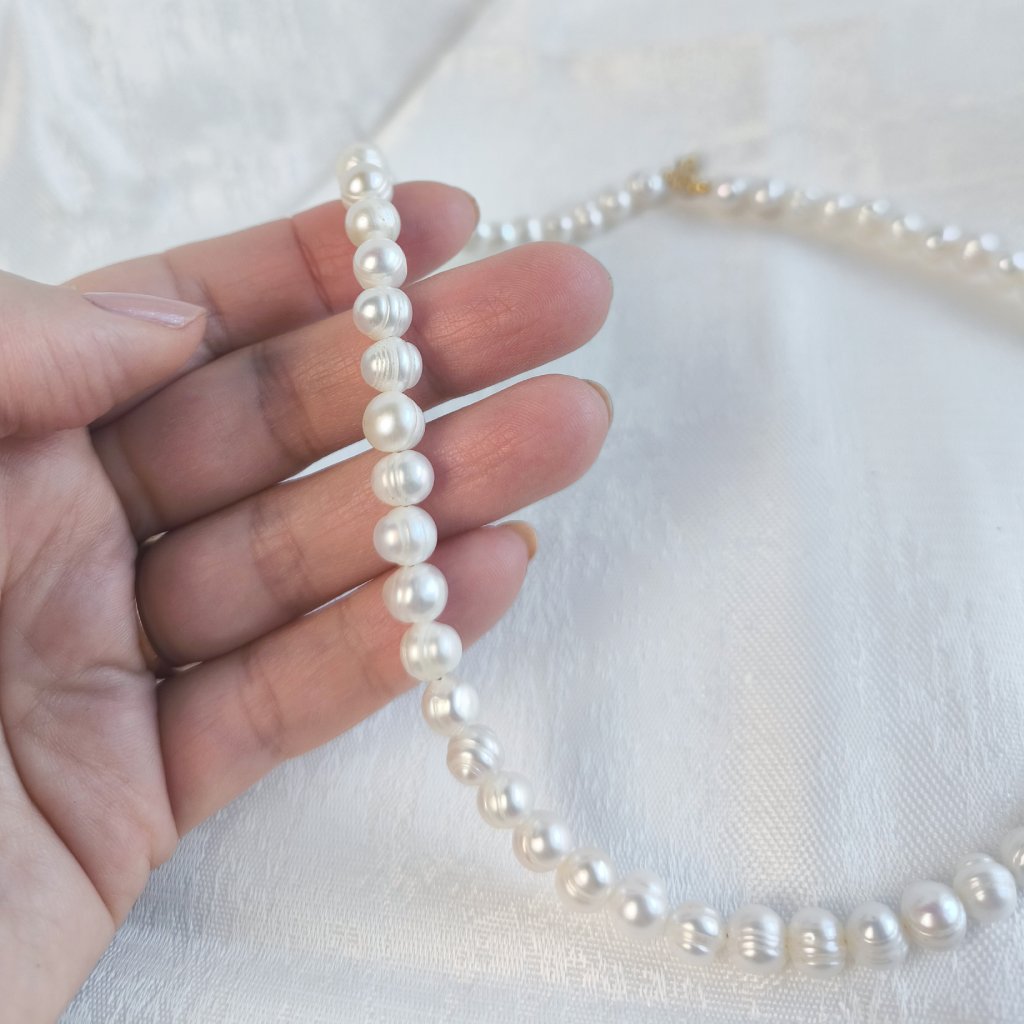 Náhrdelník z bílých perel o velikosti 7 mm, kvality A: na náhrdelníku jsou vidět rýhy a nepravidelnosti.