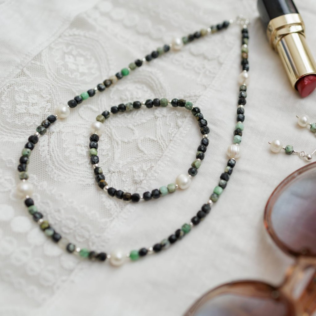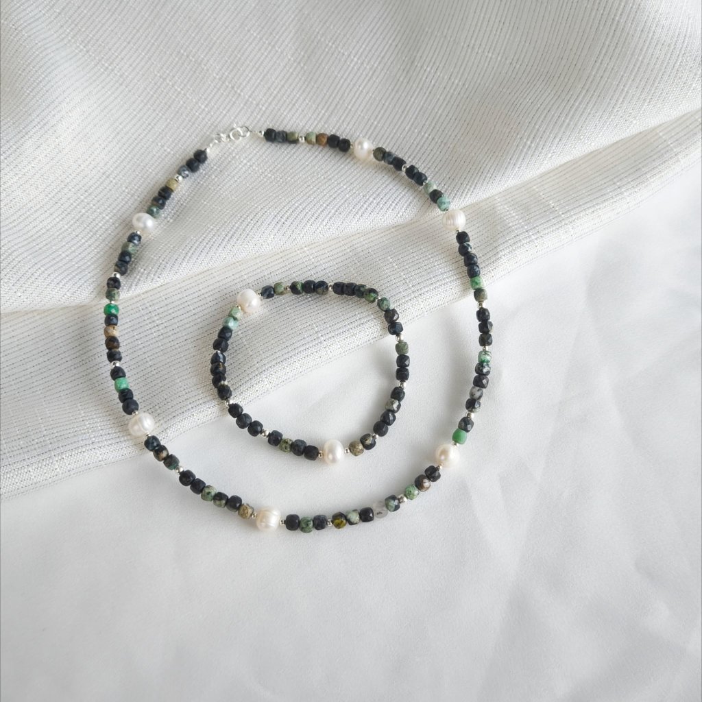 Náhrdelník je tvořen menšími kamínky afrického tyrkysu, polokulatými perlami a stříbrnými korálky, a náramek tento jemný design elegantně završuje. Celek tak tvoří dokonale sladěný set, který lze nosit společně nebo po jednotlivých kusech.