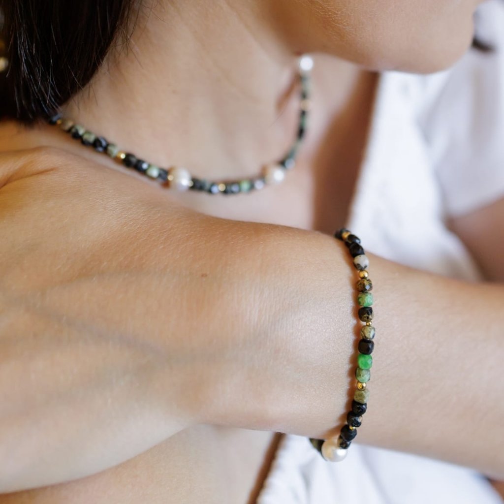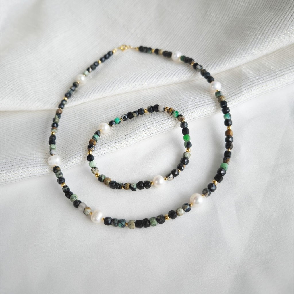 Tato elegantní souprava šperků spojuje třpyt afrického tyrkysu a nadčasovou krásu sladkovodních perel. Set tvoří náramek a náhrdelník, které byly navrženy tak, aby se dokonale doplňovaly.
