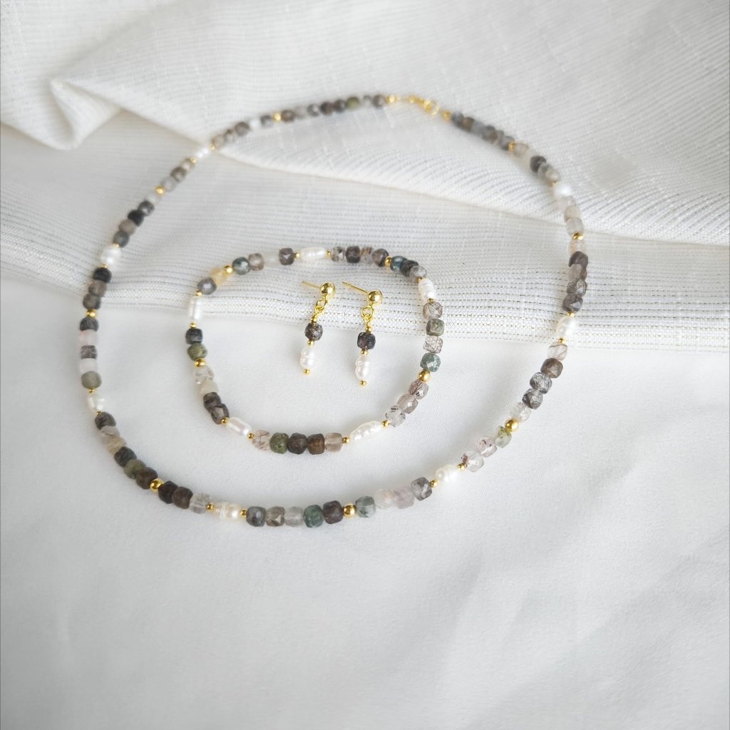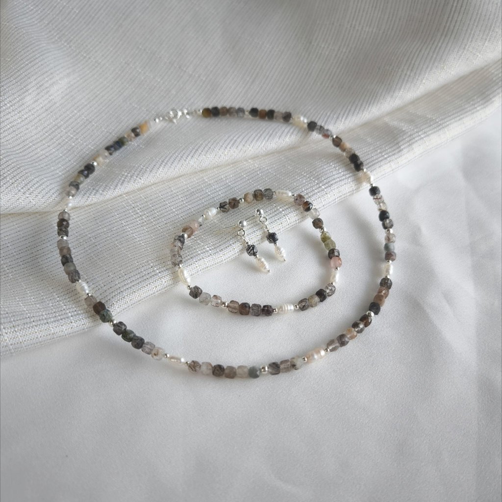 Křišťál (křemen) s turmalínem patří mezi vzácné polodrahokamy světa a jeho jemné tóny okouzlují tím, jak se mění podle světla. V kombinaci s přirozeným leskem sladkovodních perel vzniká souprava šperků, která působí harmonicky a zároveň mimořádně luxusně.