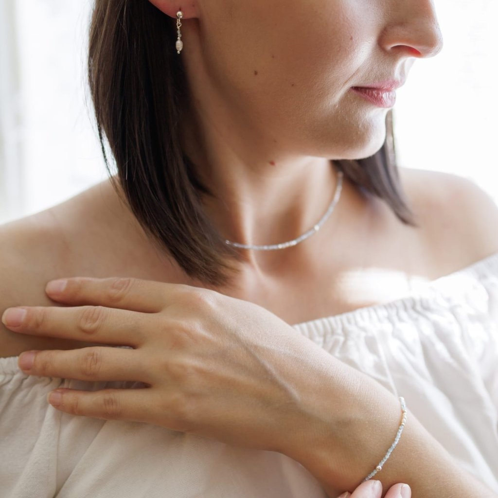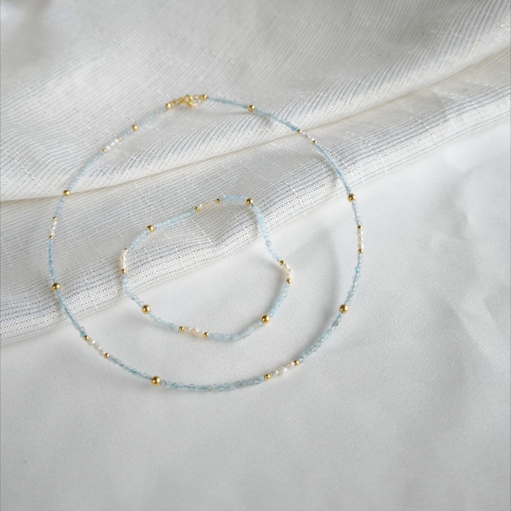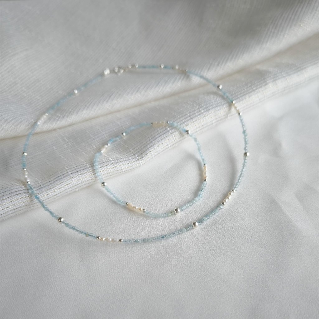 Náhrdelník je tvořen drobnými kamínky topazu, oválnými perlami a stříbrnými korálky, a náramek tento jemný design elegantně završuje. Celek tak tvoří dokonale sladěný set, který lze nosit společně nebo po jednotlivých kusech.