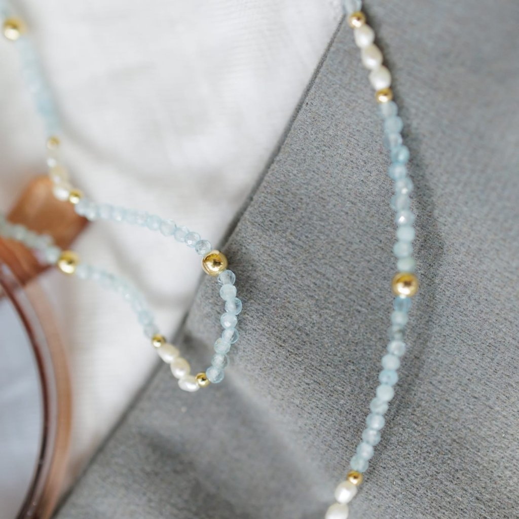 Topaz patří mezi vzácné polodrahokamy světa a jeho modré tóny okouzlují tím, jak se mění podle světla. V kombinaci s přirozeným leskem sladkovodních perel vzniká souprava šperků, která působí harmonicky a zároveň mimořádně luxusně.