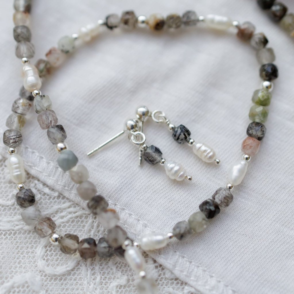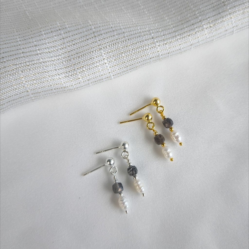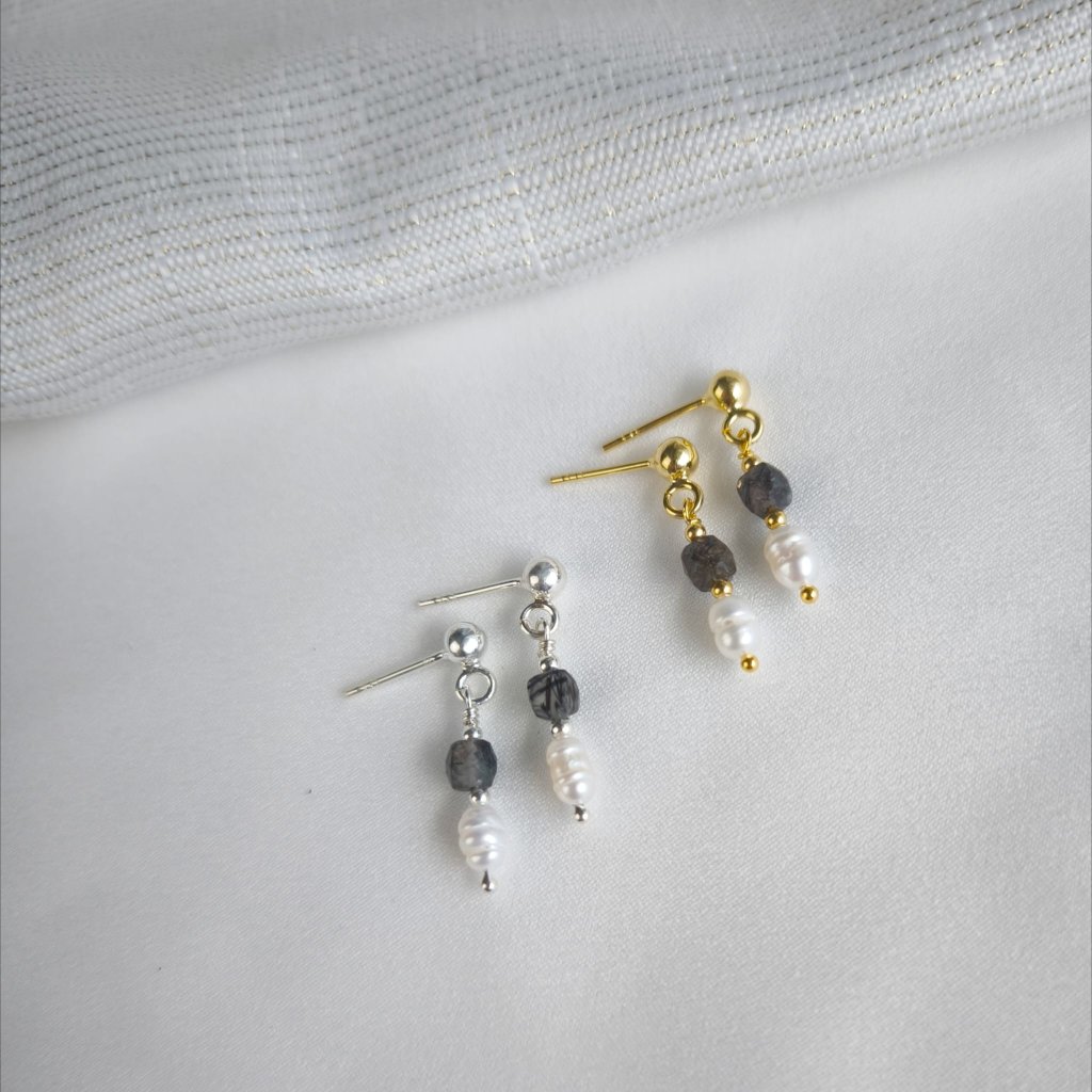 Křišťál s turmalínem patří mezi nejoblíbenější polodrahokamy světa a okouzluje svými čirými, hnědými až šedo-černými tóny, které se mění podle světla. V kombinaci s přirozeným leskem sladkovodních perel vznikají náušnice, které působí harmonicky, ale zároveň mimořádně luxusně.