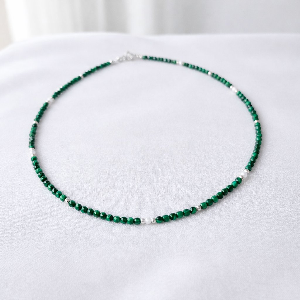 Jemný, ale výrazný šperk, který spojuje sílu přírodního kamene s nadčasovou elegancí perel. Tento ručně vyráběný náhrdelník je tvořen z drobně broušeného malachitu, jehož sytě zelená barva krásně kontrastuje s malými bílými perlami. Výsledkem je lehký, harmonický šperk vhodný pro každodenní nošení i slavnostnější příležitosti.