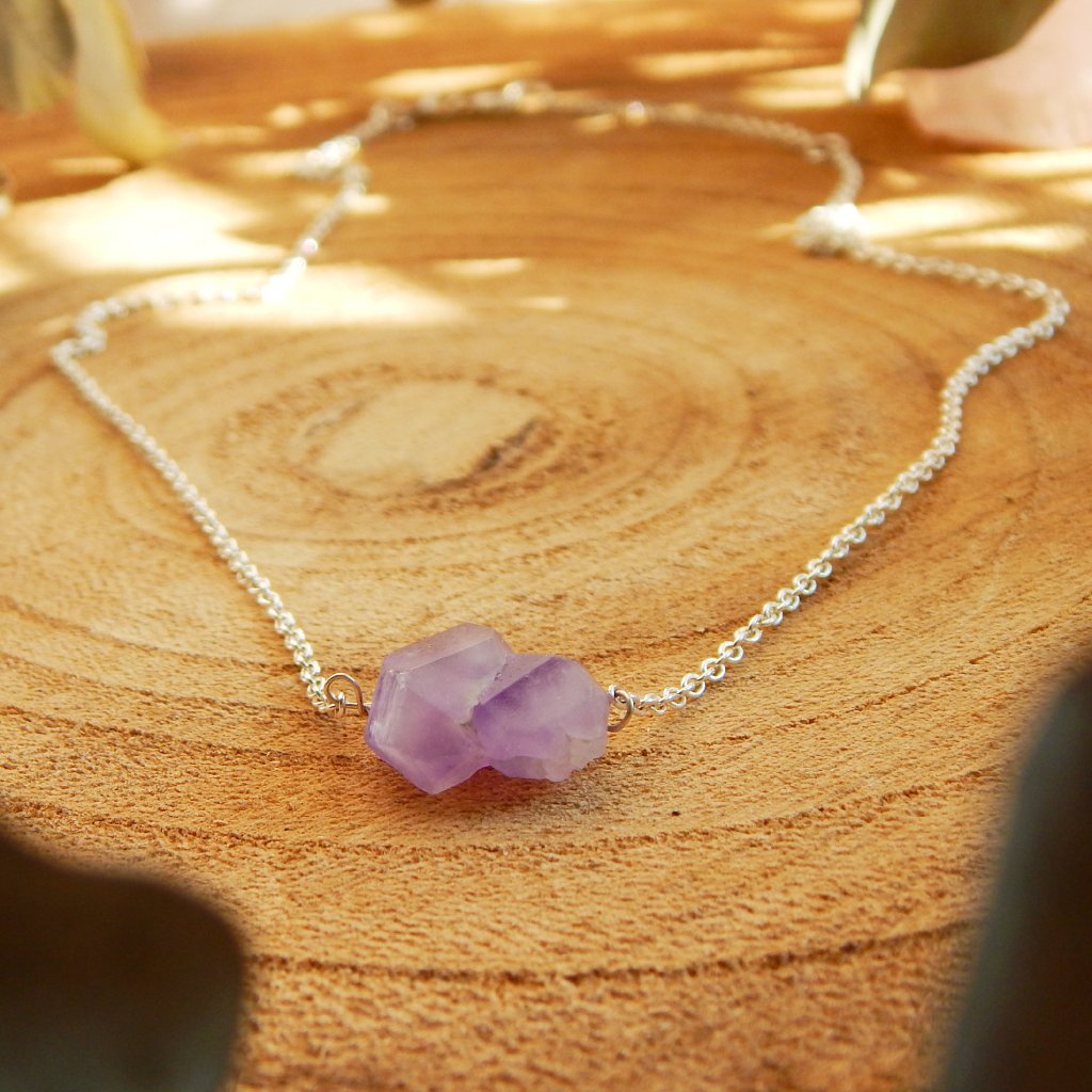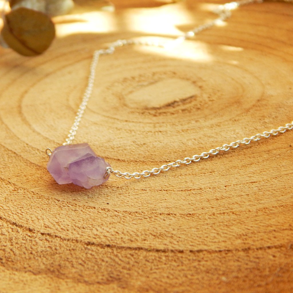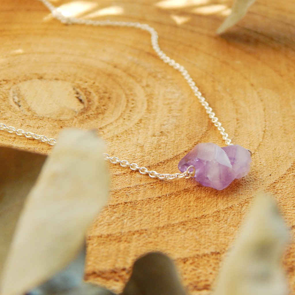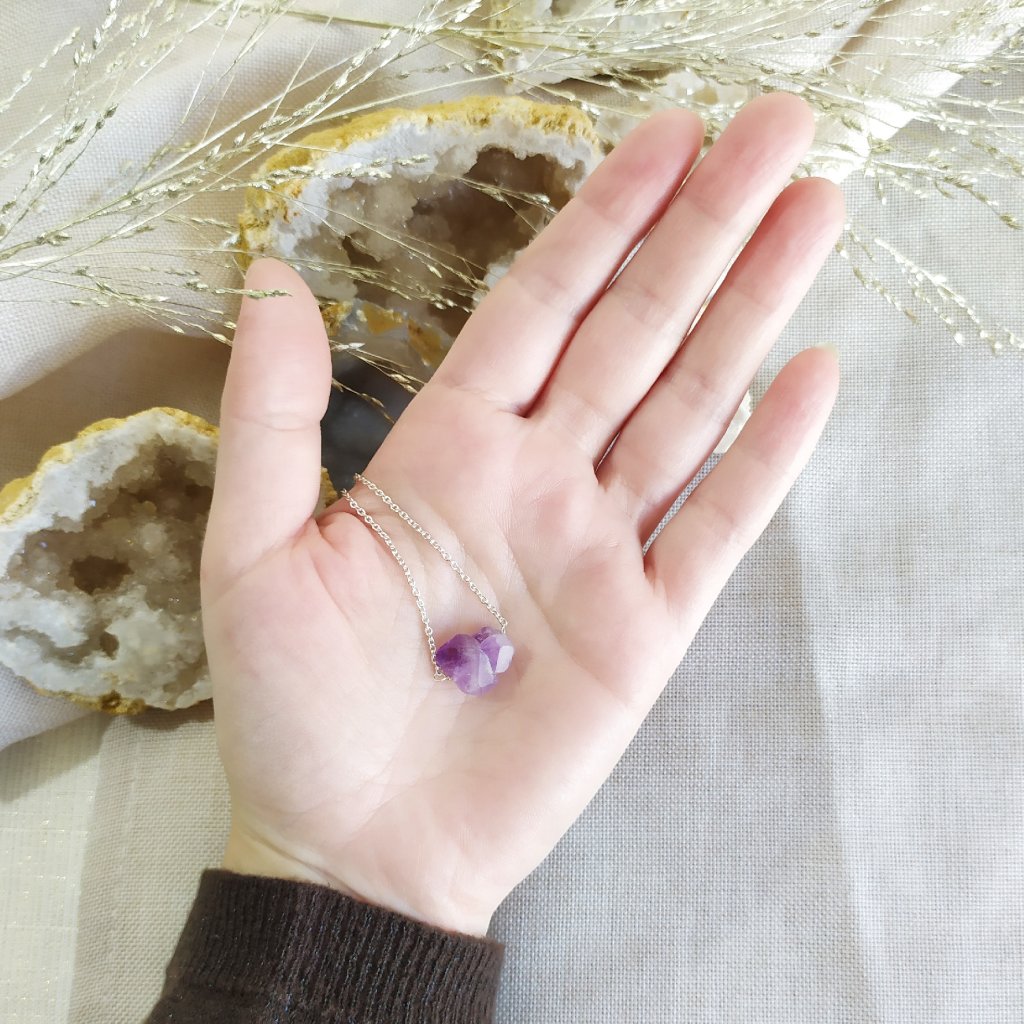Náhrdelník je vyroben ze stříbra o ryzosti 925/1000 a osazen surovým ametystem. Ametyst je kamenem duchovní čistoty a meditace, dodává rozhodnost a posiluje intuici.