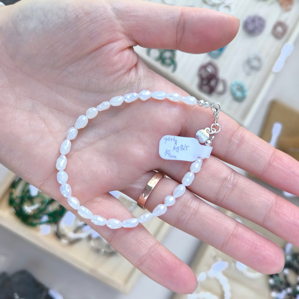 Jemný náramek z malých nepeavidelnych bílých perel se hodí pro každodenní nošení. Tento stříbrný perlový náramek jsme vyrobili ze sladkovodních bílých perel a doplnili ho zapínáním ze stříbra o ryzosti 925/1000.