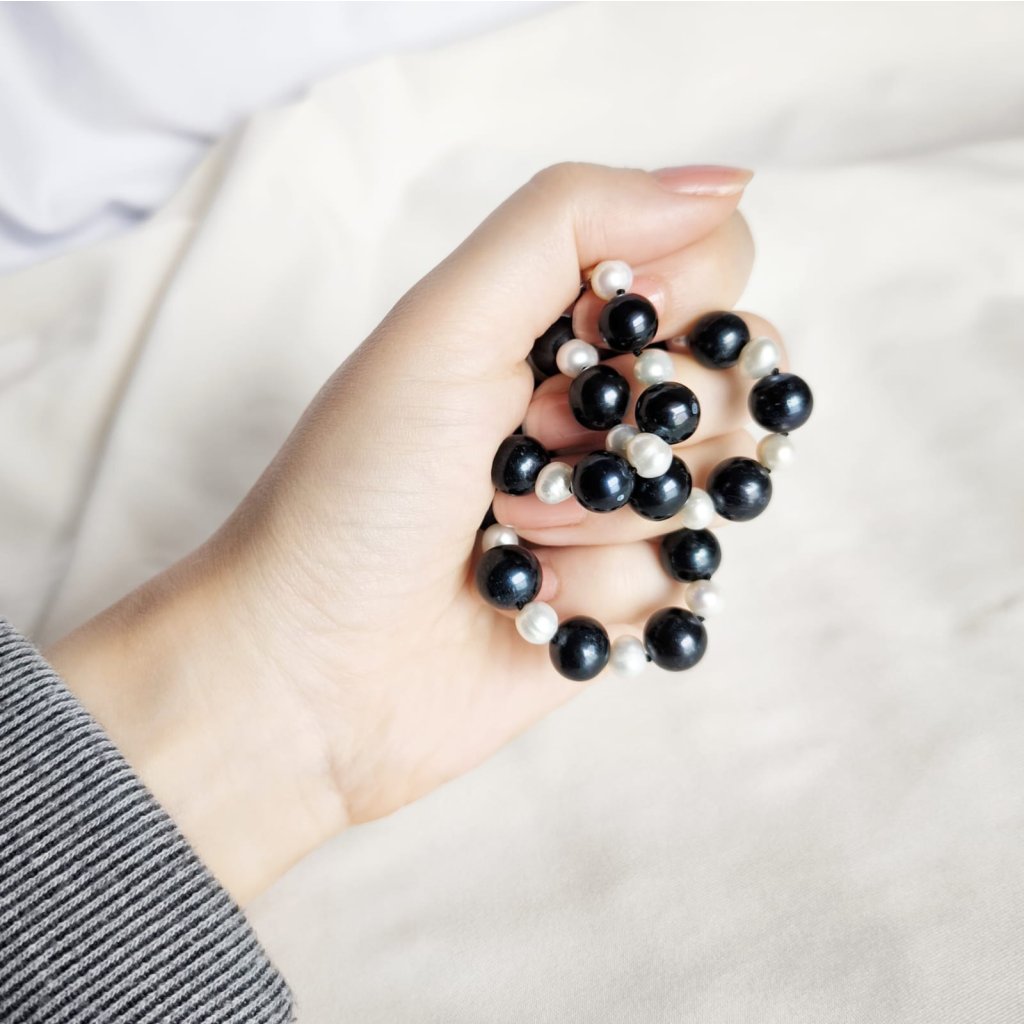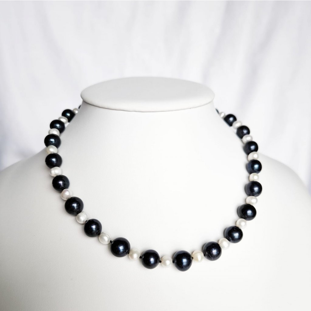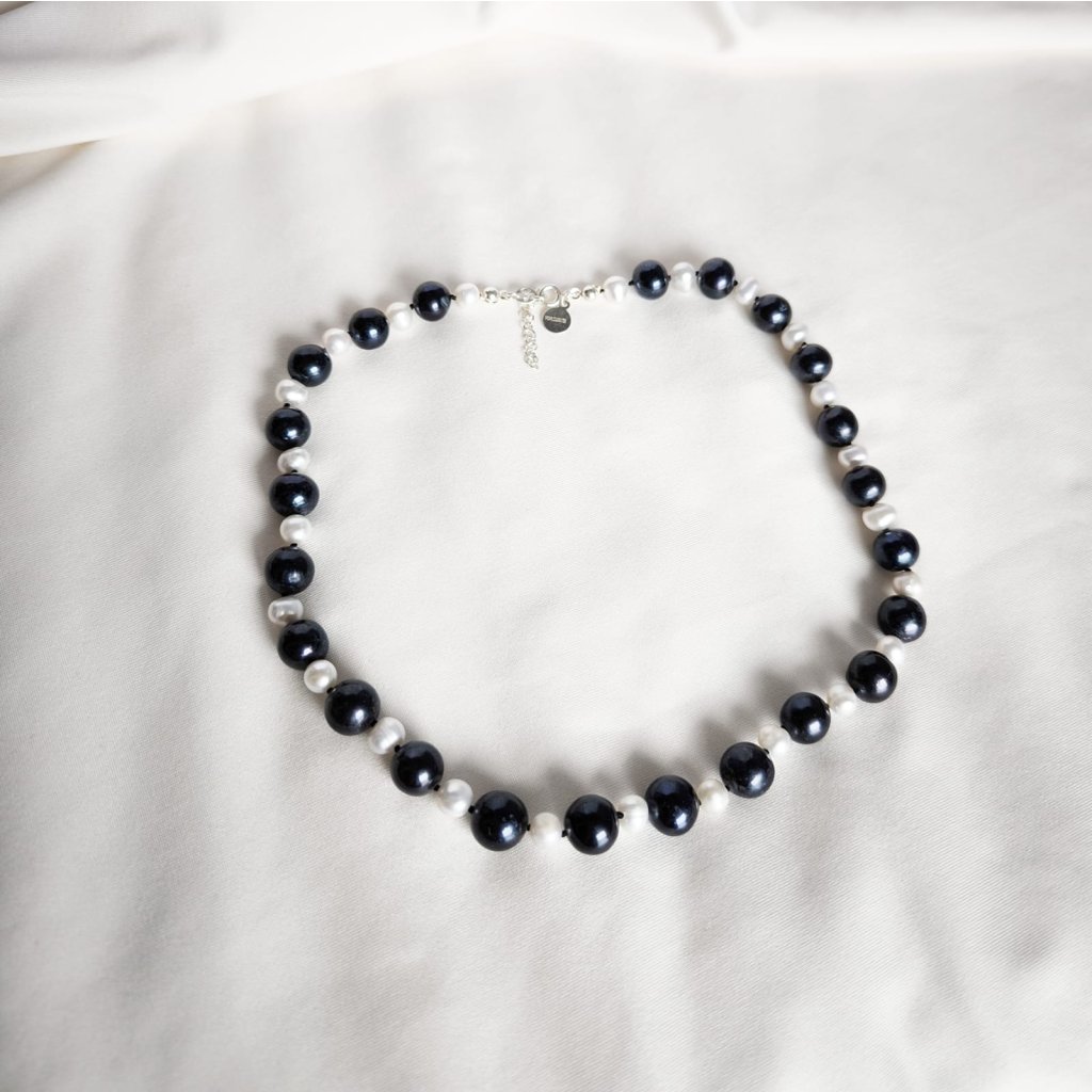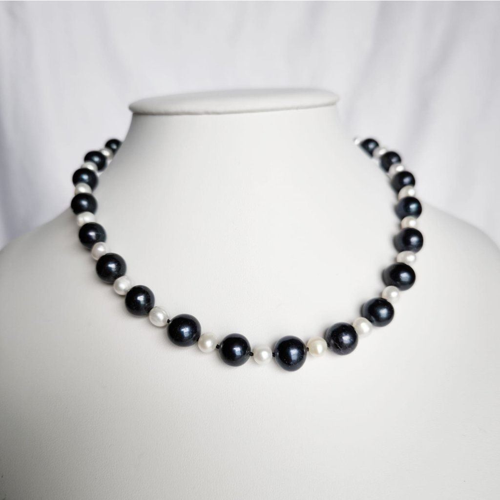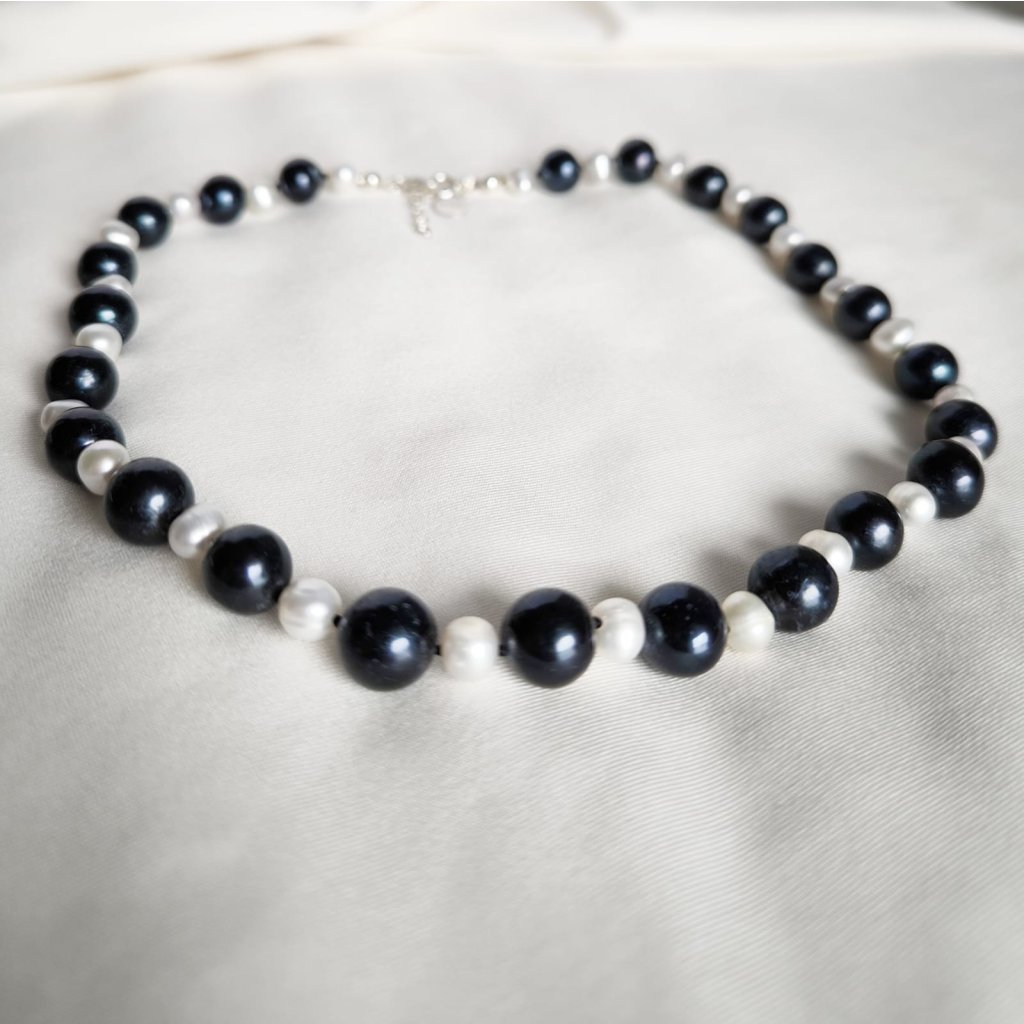 Představte si luxusní zážitek, kdy perlový náhrdelník něžně obepne váš krk. Tento exkluzivní šperk, tvořený nádhernými bílými a černými sladkovodními perlami, se stane středobodem každého outfitu.