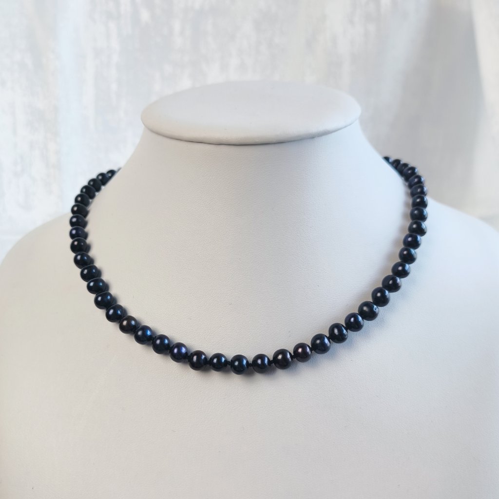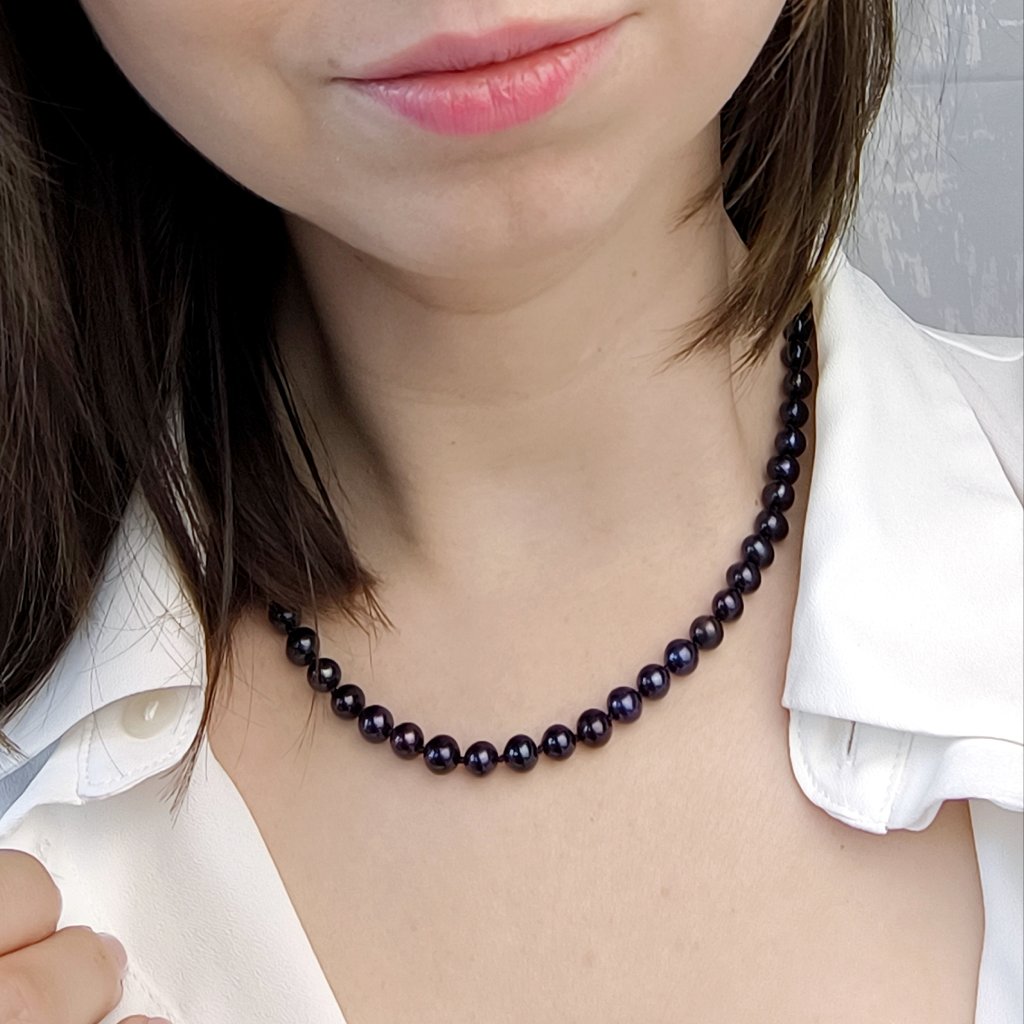Náhrdelník ze skoro kulatých perel o velikosti 7 mm je šperkem, který se hodí do malého i velkého výstřihu. Délka náhrdelníku je 45 cm, což je délka, která spadá pod klíční kosti. Hodí se jako šperk pro každodenní nošení i ke slavnostním příležitostem.