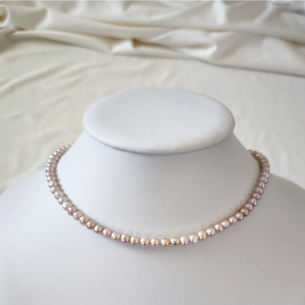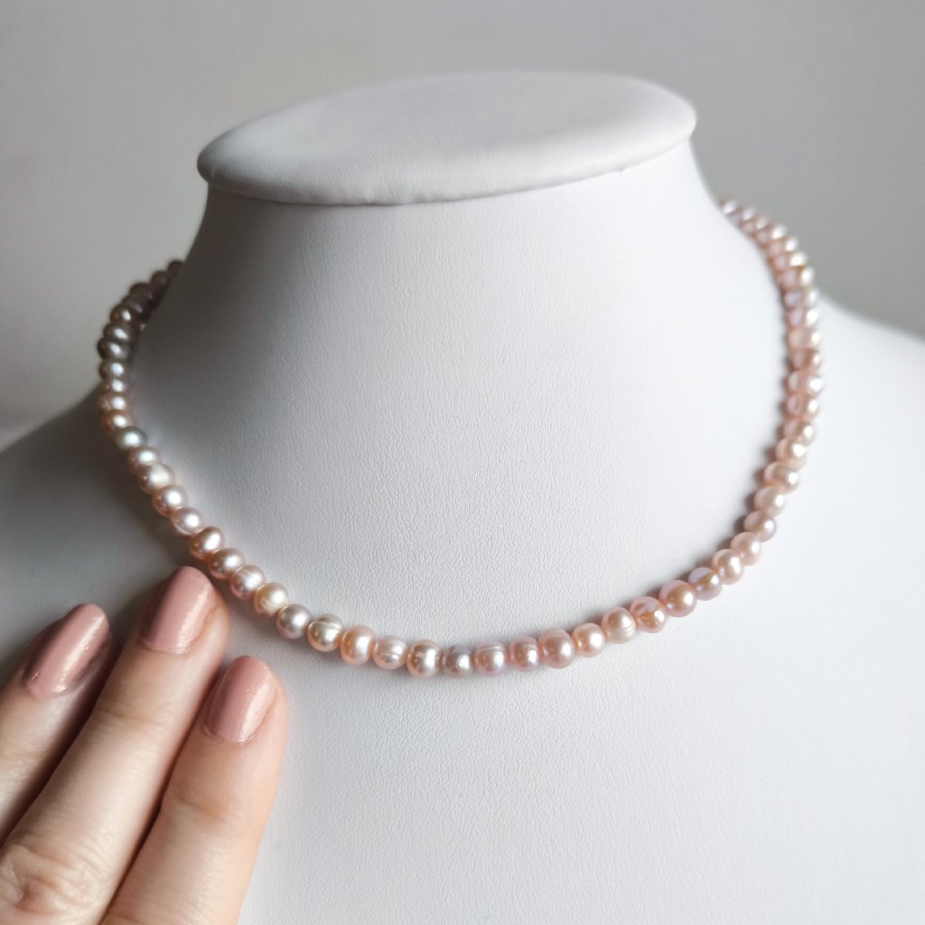 Náhrdelník z růžových perel o velikosti 5,5 mm je minimalistickém šperkem. Délka náhrdelníku je 40 cm. Tento náhrdelník v délce choker bude něžně obepínat váš krk těsně nad klíčními kostmi. Hodí se jako lehký šperk pro každodenní nošení i jako slavnostní.