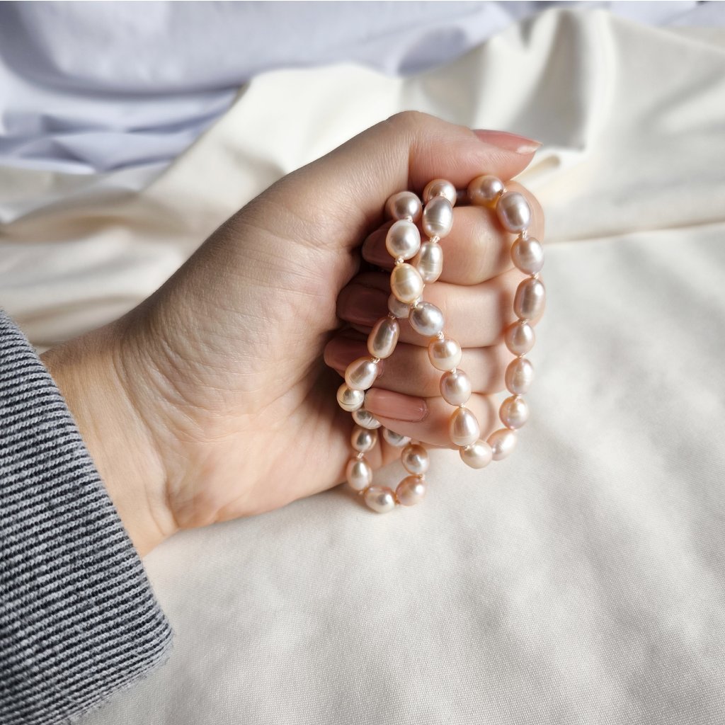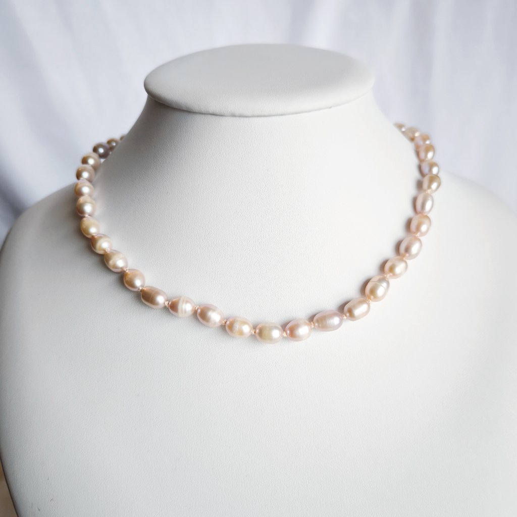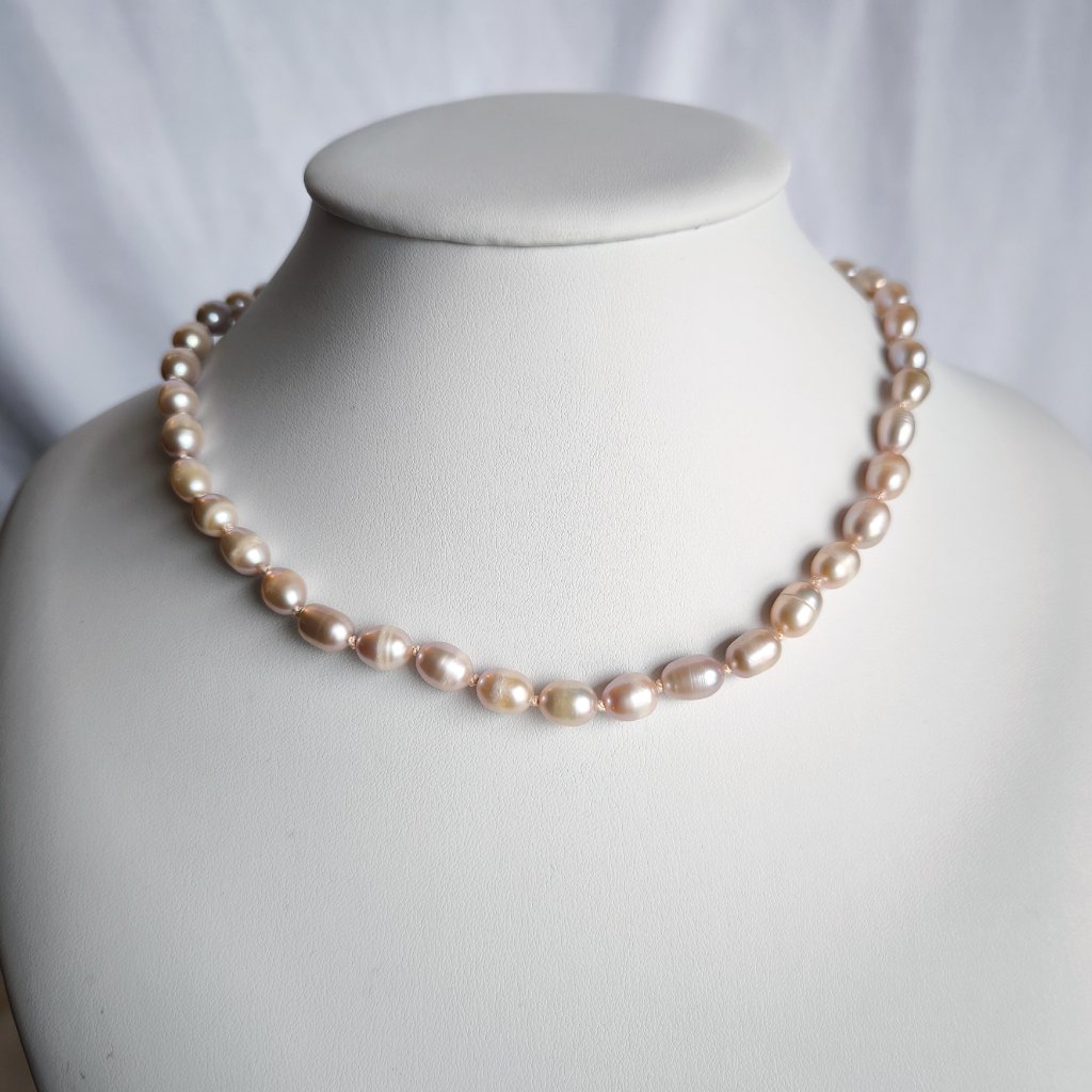 Náhrdelník z růžových perel o velikosti 9 mm bude nepřehlédnutelný. Perly jsou oválné, tzv. rýžové, vznikne tak šperk, který je klasický, ale vhodný pro každodenní nošení. S délkou 44 cm náhrdelník spadá na klíční kosti, bude tak vhodný i do menších výstřihů.