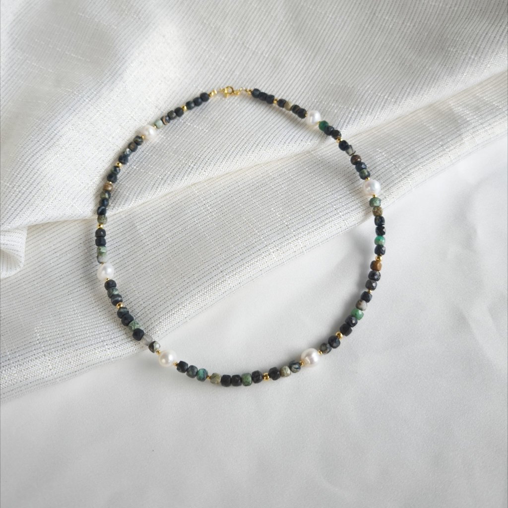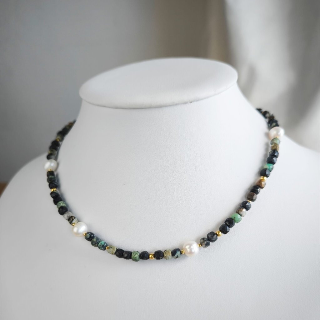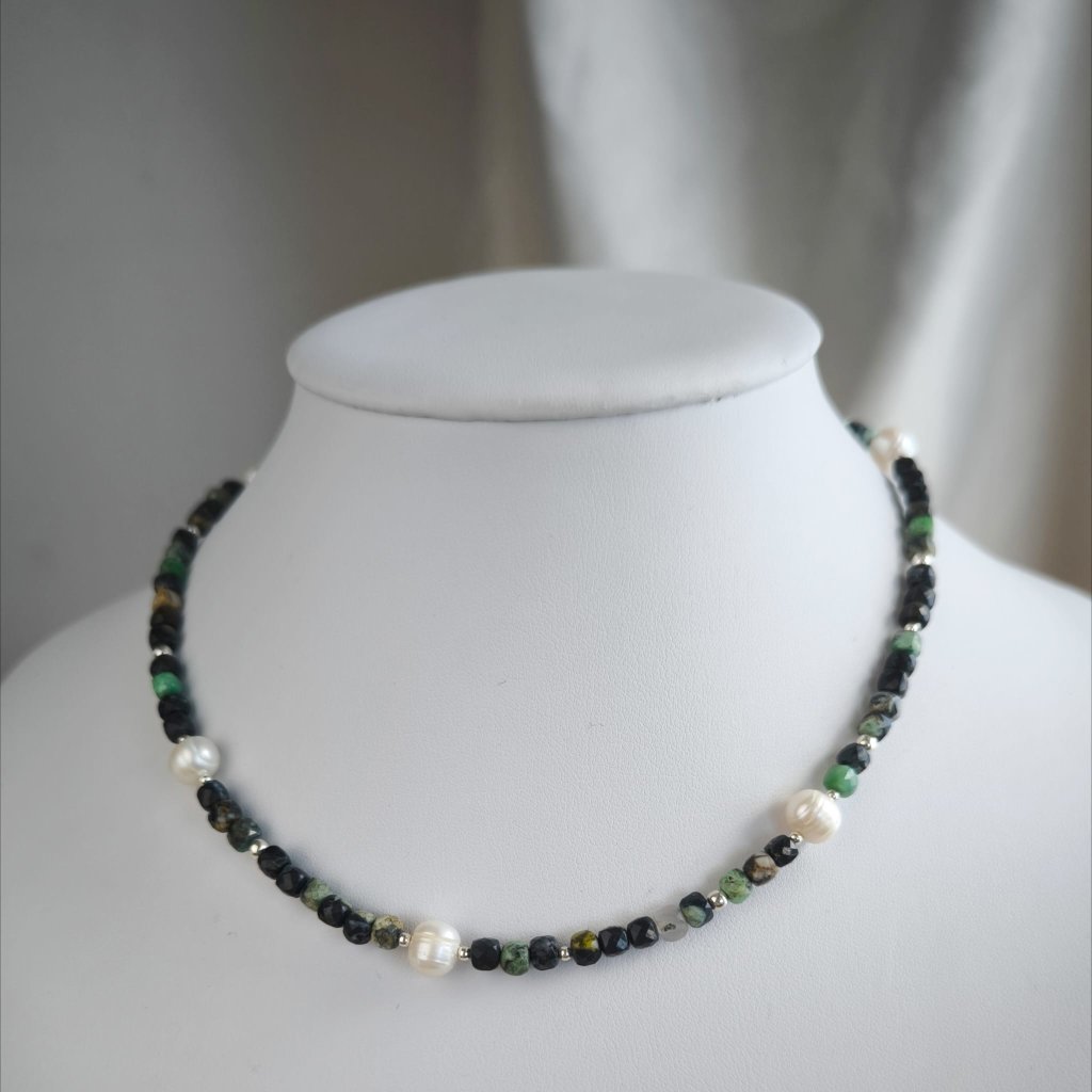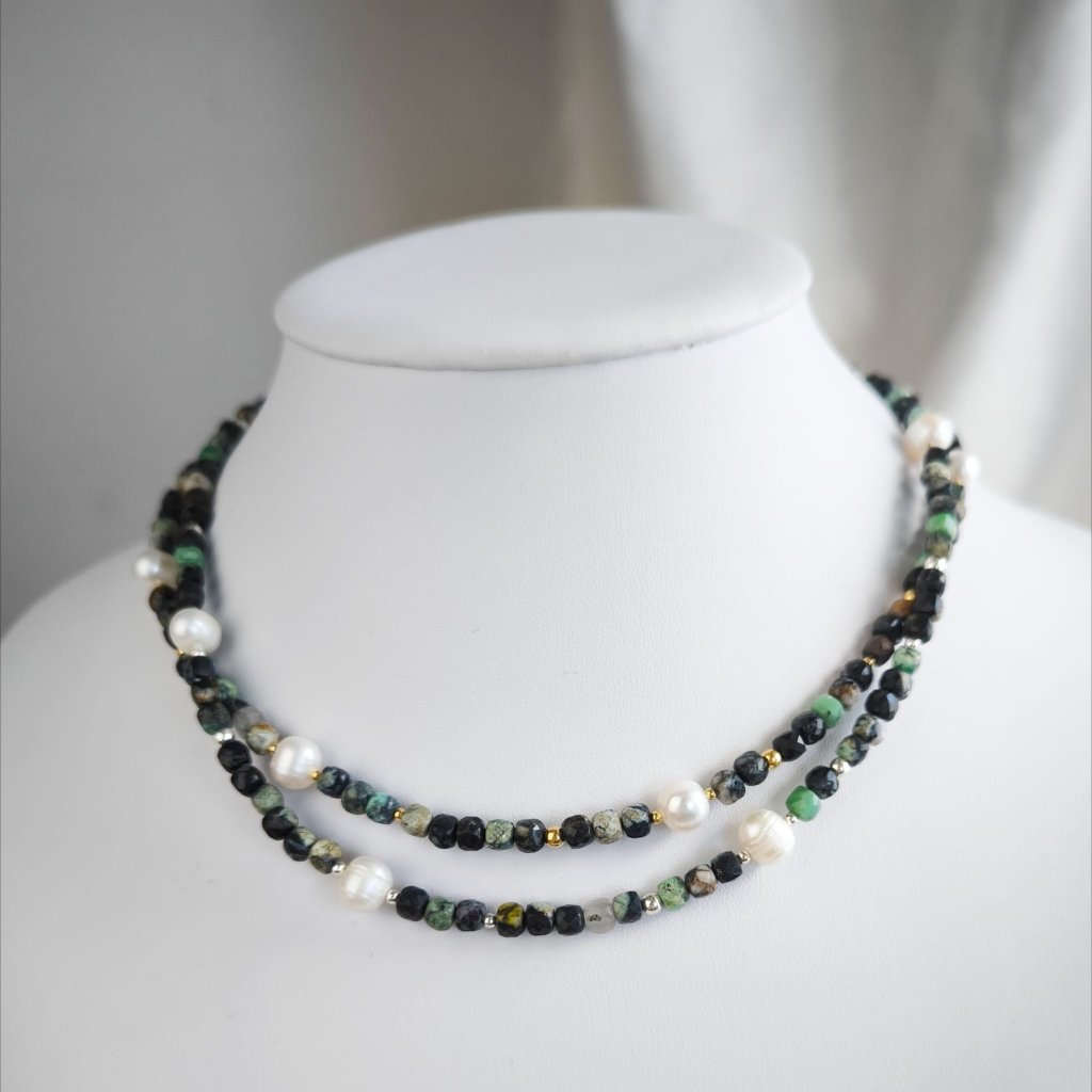 Tento originální náhrdelník spojuje sílu přírodního kamene a jemnou eleganci perel. Je vyroben z afrického tyrkysu broušeného do tvaru drobných kostek s decentním výbrusem, který nechává vyniknout jeho hnědo-černo-zeleným odstínům.