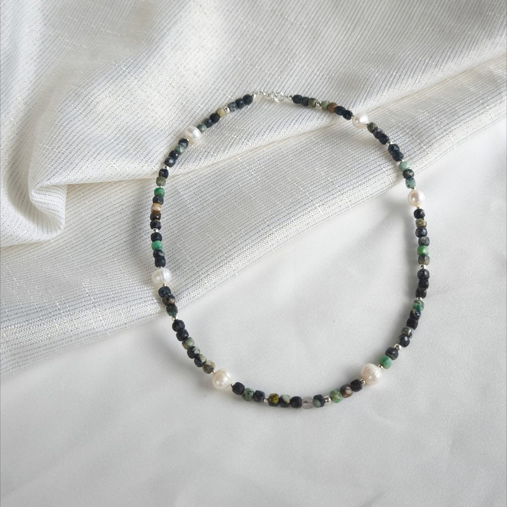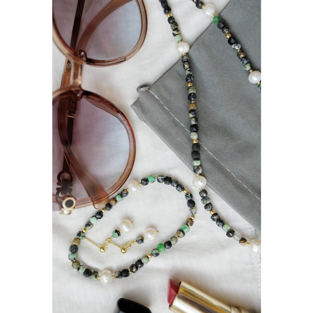 Africký tyrkys je minerál, který zaujme svou unikátní kresbou v odstínech hnědé, černé a zelené barvy. V kombinaci se zářivým leskem sladkovodních perel vzniká originální spojení, které je elegantní a přirozeně luxusní. Tento kontrast mezi jemností perel a hrubší strukturou minerálu činí šperk výjimečným.