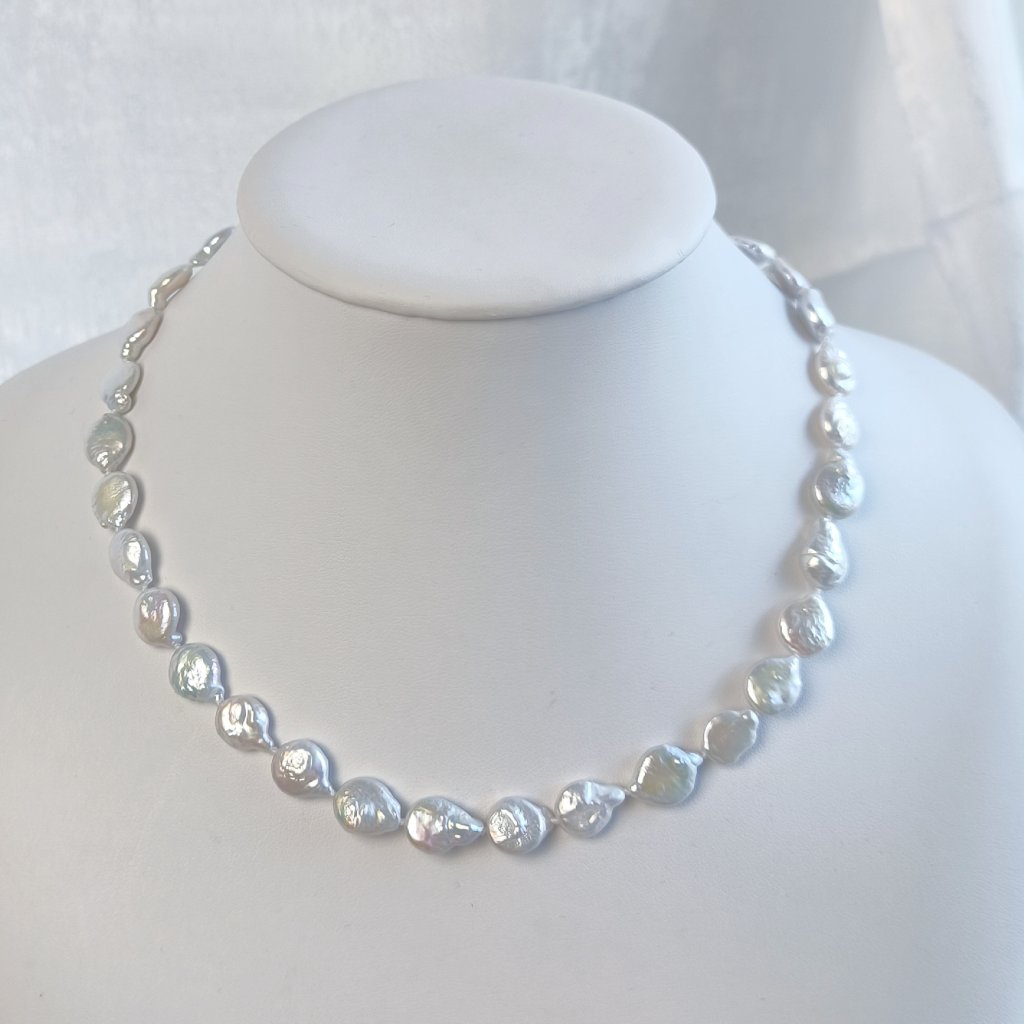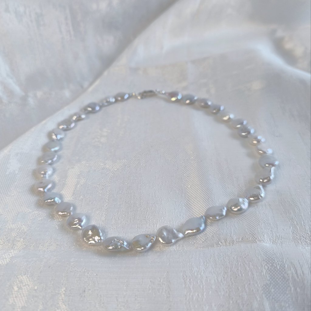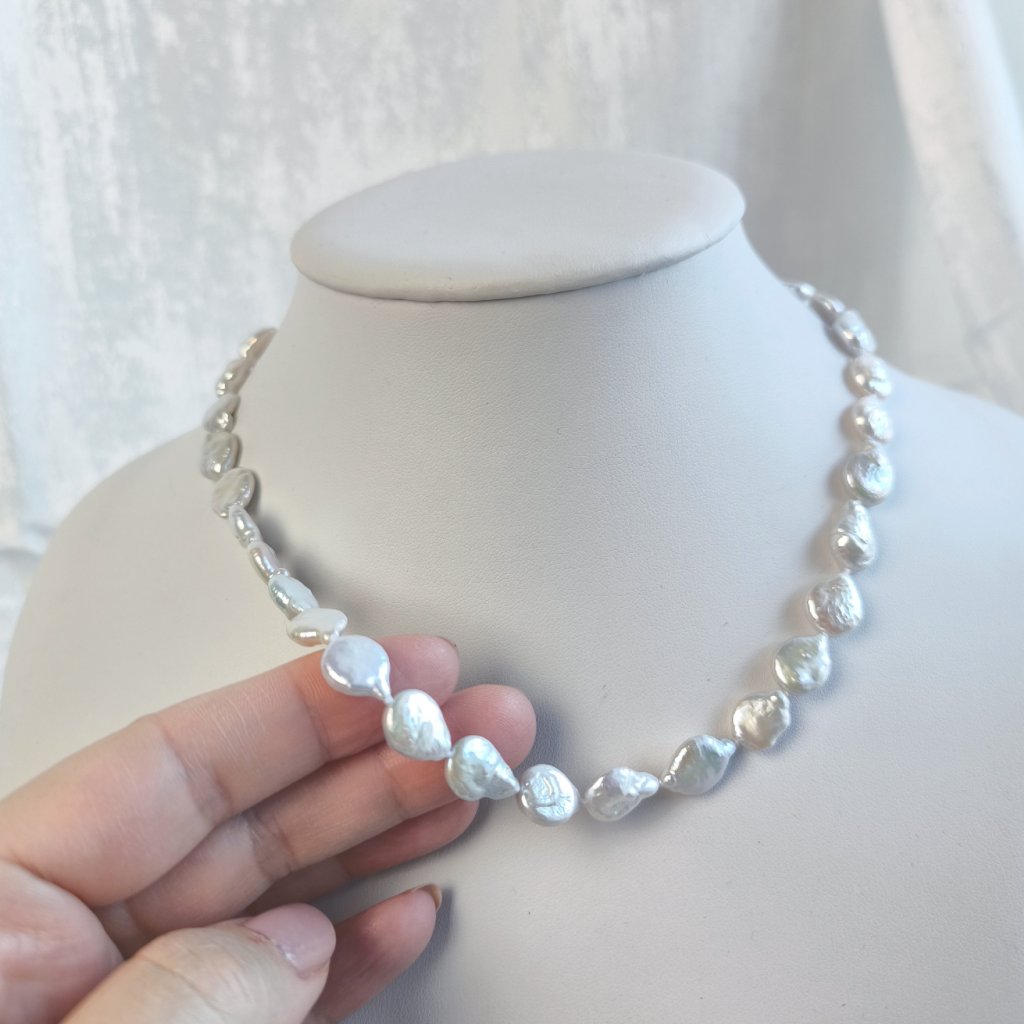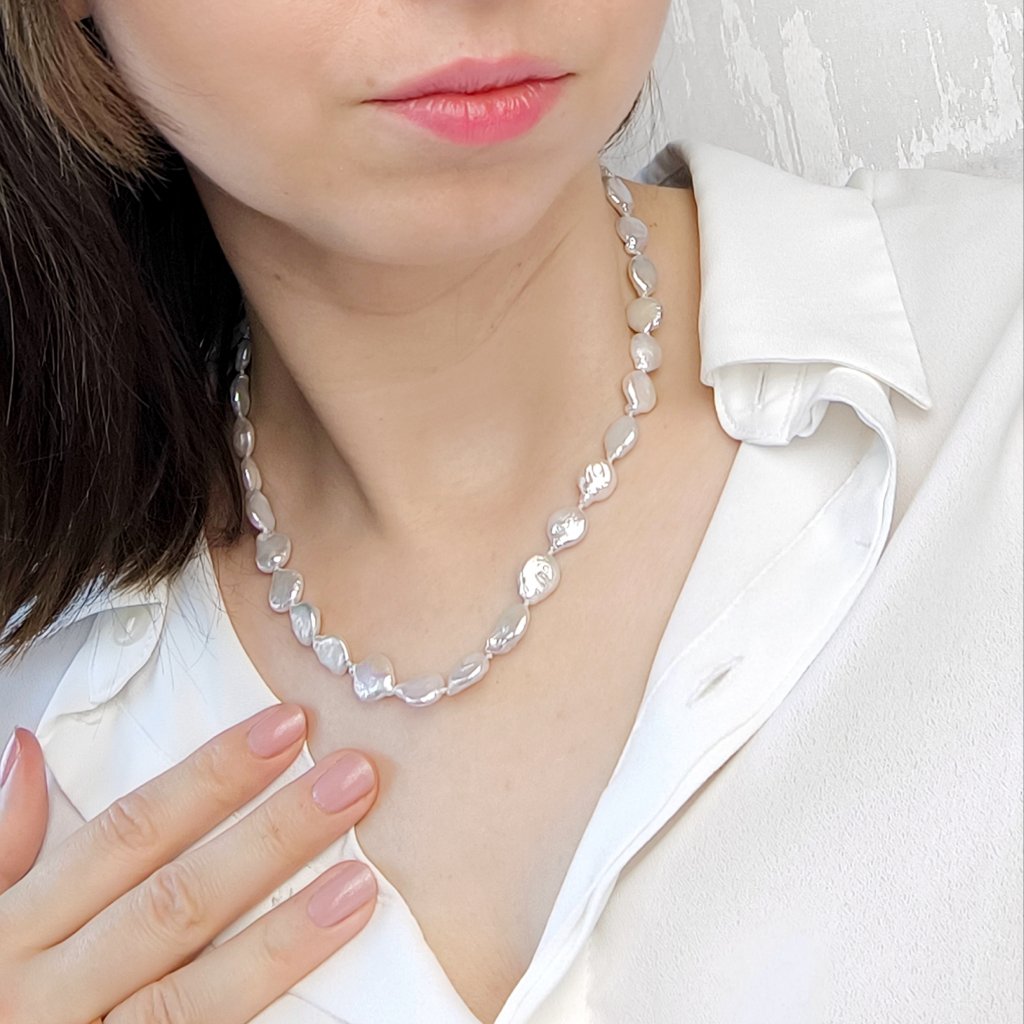 Náhrdelník z barokních perel o velikosti cca 10 je šperkem, který se hodí do malého i velkého výstřihu. Délka náhrdelníku je 45 cm, což je délka, která spadá pod klíční kosti. Hodí se jako šperk pro každodenní nošení i ke slavnostním příležitostem.