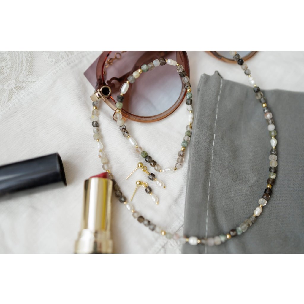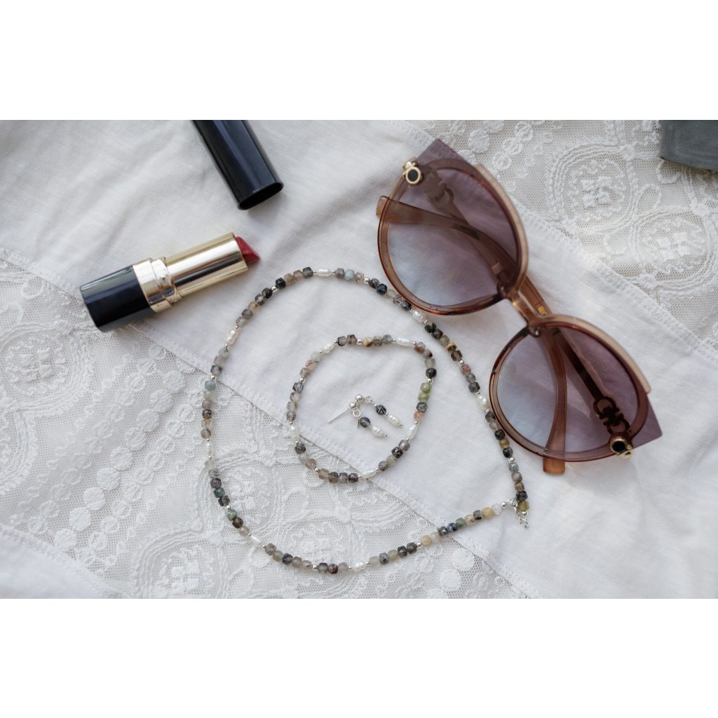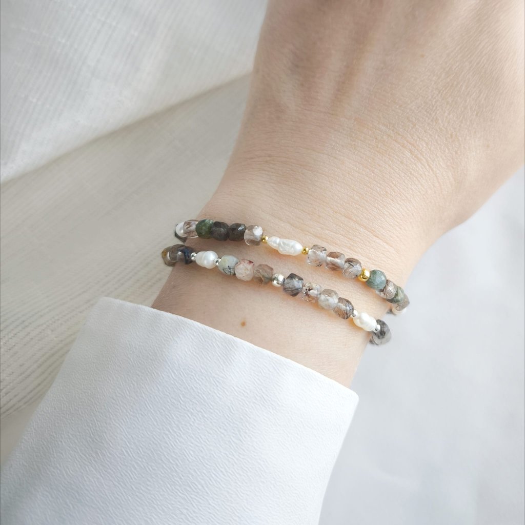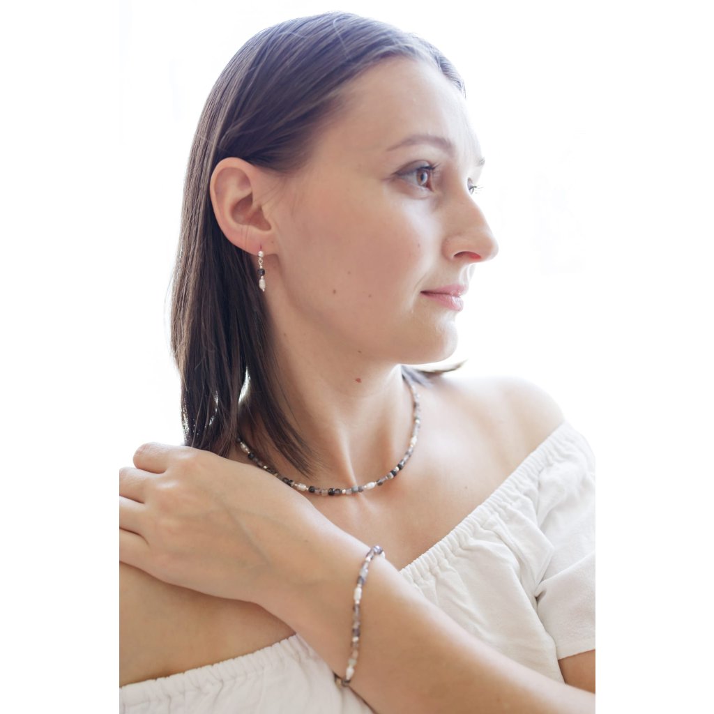 Minerál doplňují oválné sladkovodní perly a drobné stříbrné korálky, jež podtrhují vyvážený design. Díky pružnému provedení se náramek snadno navléká a pohodlně nosí každý den.
