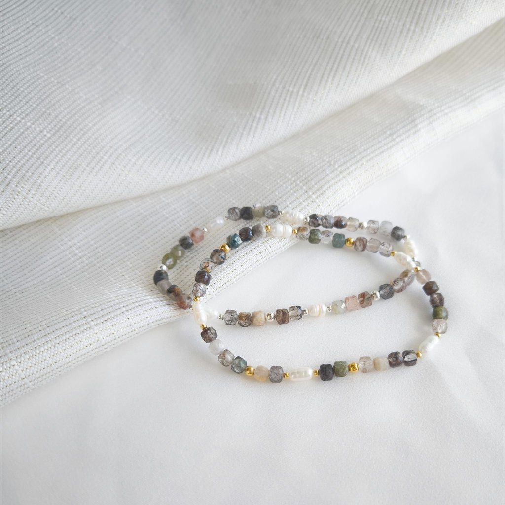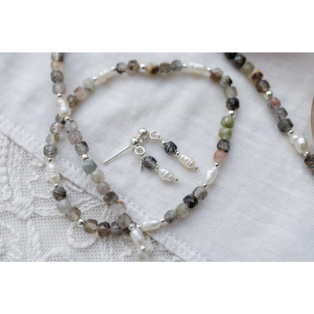 Tento originální náramek spojuje sílu přírodního kamene a jemnou eleganci perel. Je navlečen z křišťálu s turmalínem broušeného do tvaru drobných kostek s decentním výbrusem, který nechává vyniknout jeho zajímavým vrostlicím turmalínu.