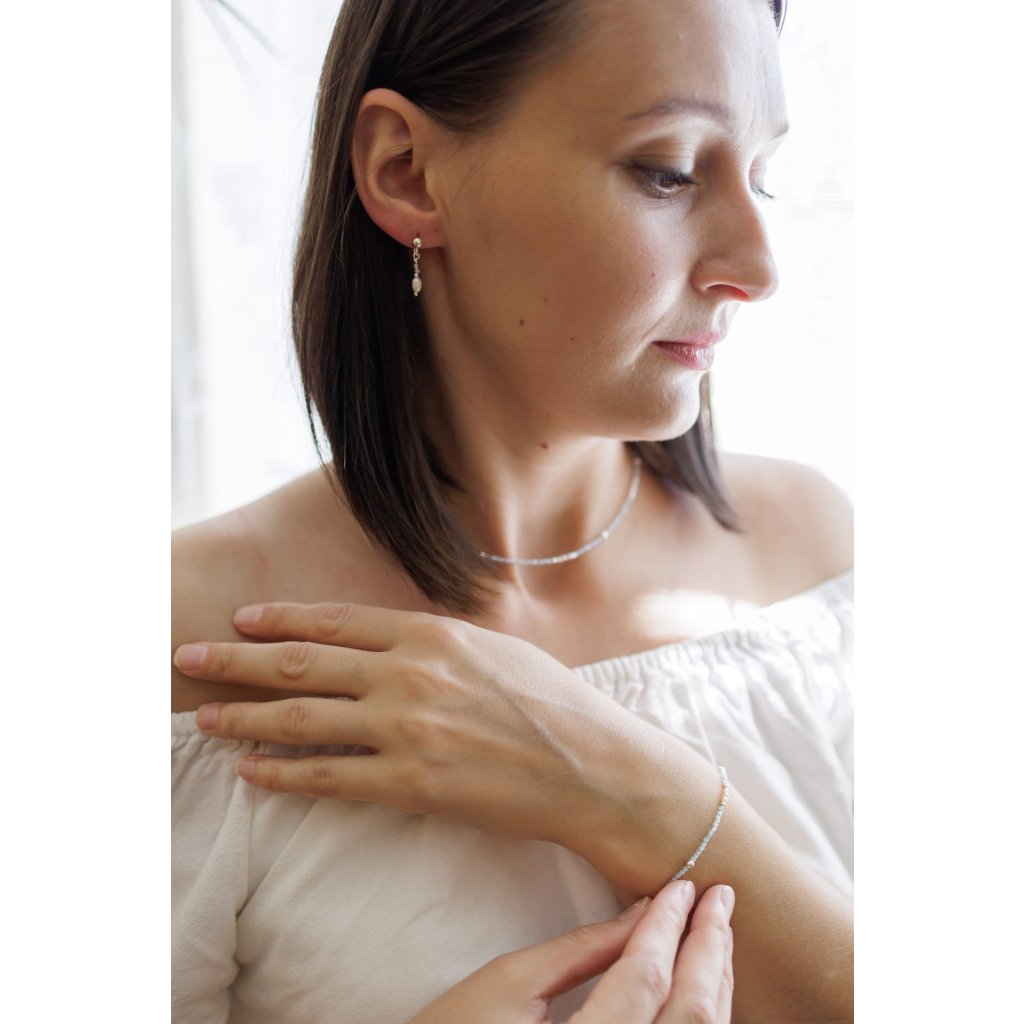 Mini broušené kamínky o velikosti 2 mm dodávají šperku lehkost a decentní třpyt, zatímco oválné perly vnášejí do designu nadčasovou jemnost. Celek dotvářejí malé stříbrné korálky, díky nimž působí náramek vyváženě a sofistikovaně.