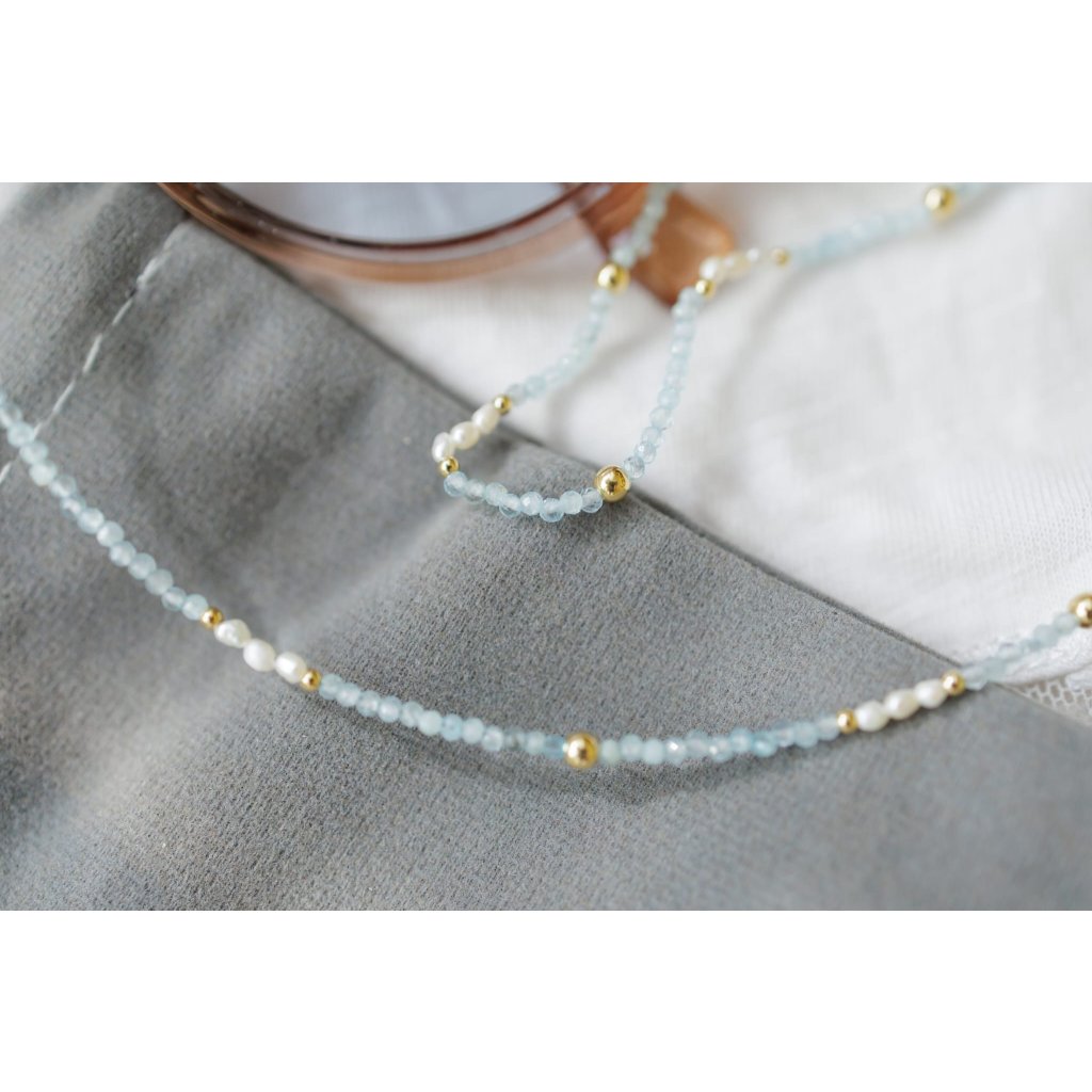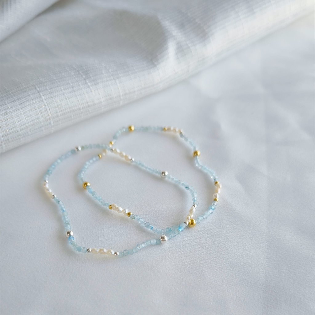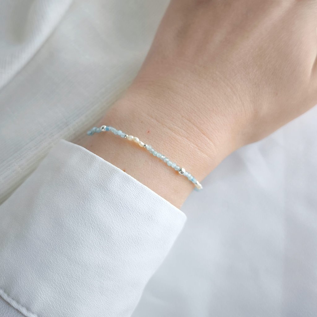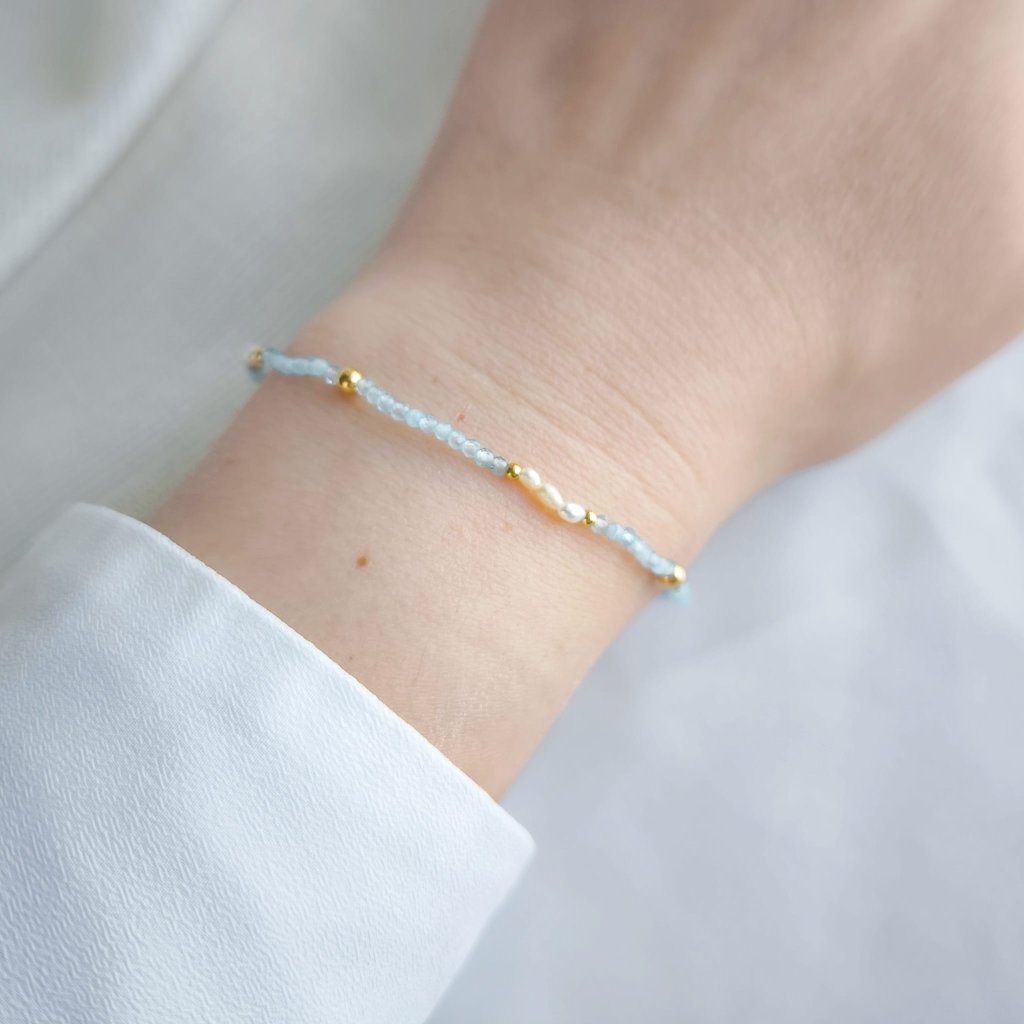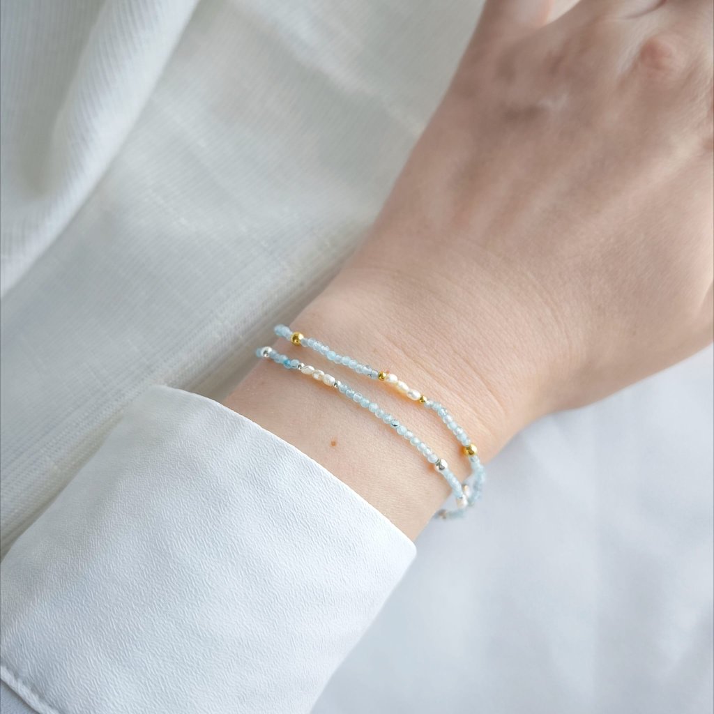 Tento jemný náramek spojuje třpyt vzácného tanzanitu a nadčasovou krásu perel. Je navlečen z mini broušených 2mm kamínků topazu s jemně modrým nádechem, který ožívá při pohybu.
