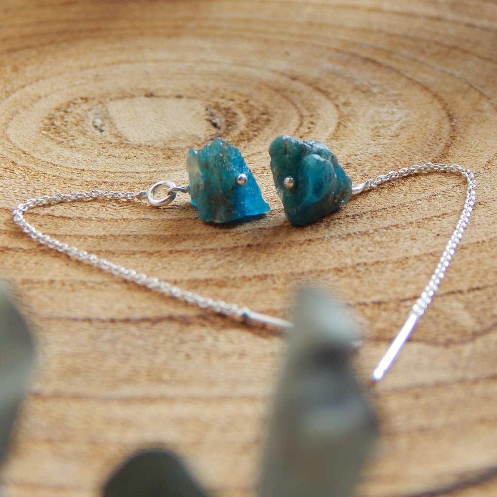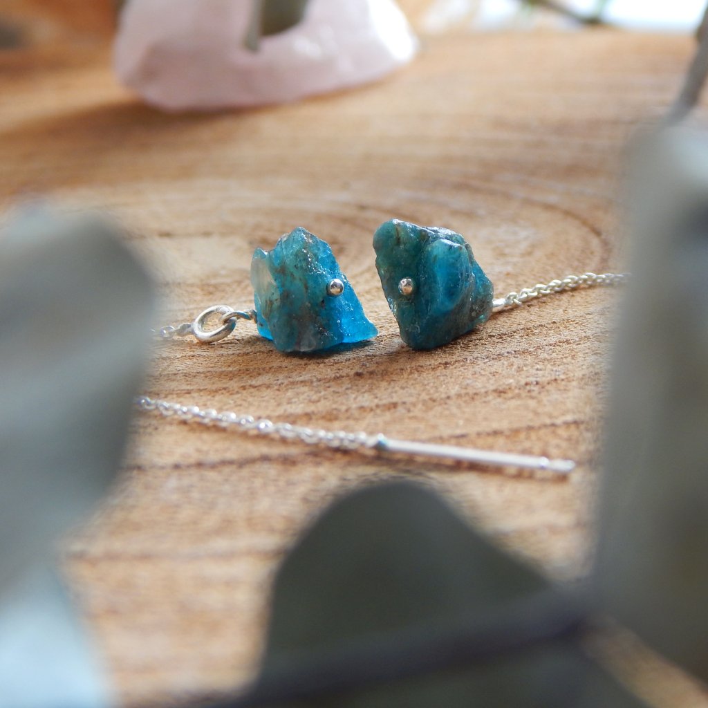 Náušnice jsou vyrobeny ze stříbra o ryzosti 925/1000 a osazeny surovým apatitem. Apatit dodává sílu a povzbuzuje tvůrčí schopnosti.