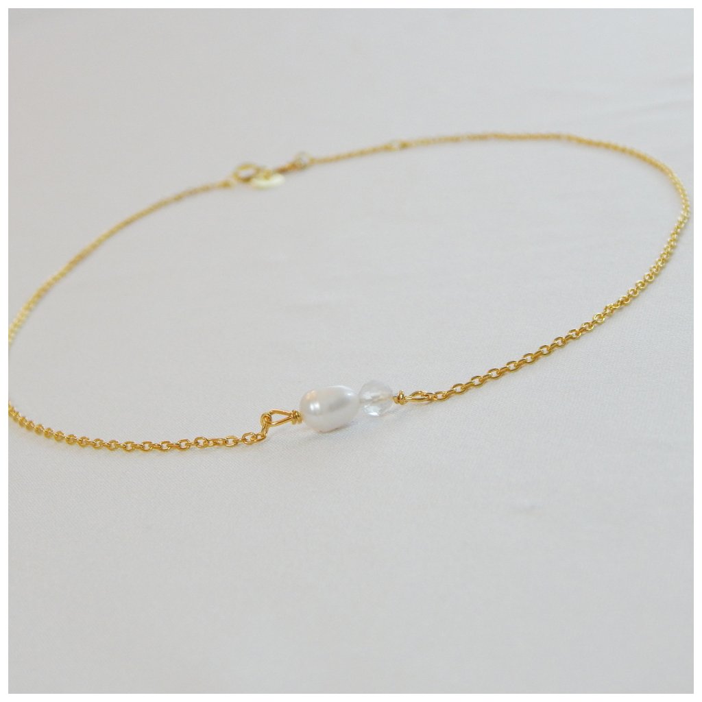 Zlacený perlový náhrdelník s bílou perlou a broušeným křišťálem CRYSTAL CK77002