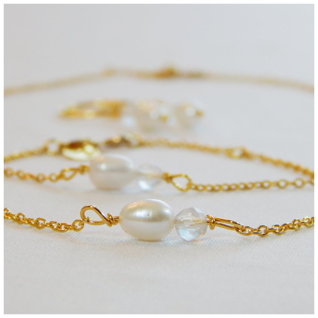 Pozlacený náramek se sladkovodní perlou a broušeným křišťálem je jedinečnou součástí naší nové kolekce CRYSTAL. Na náramek jsme použili zlacené stříbro o ryzosti 925/1000 a ozdobili jsme ho sladkovodními kultivovanou perlou, která má oválný tzn. rýžový tvar. Na perle najdete jen minimum nerovností nebo jemných rýh. Křišťál je fazetovaný a díky tomu odráží světlo, takže se pod paprsky slunce i zářivek jemně leskne a třpytí. Tento minimalistický náramek může být i skvělým tipem na dárek.